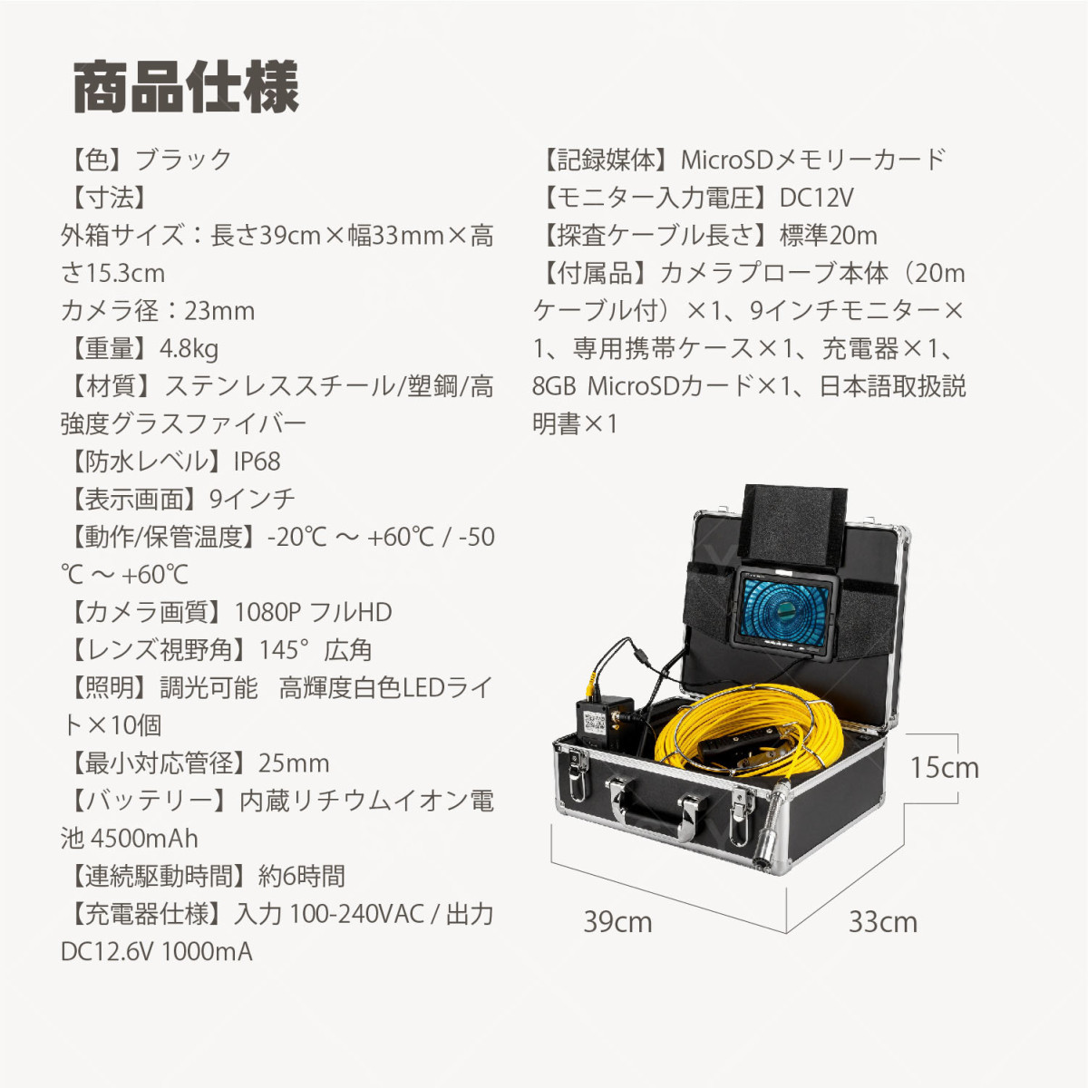 Kurflo管内検査カメラ 配管カメラ 20m 調光可能な10連LEDライト 高精細1080P 9インチモニター 内蔵8GB 充電式 收藏
