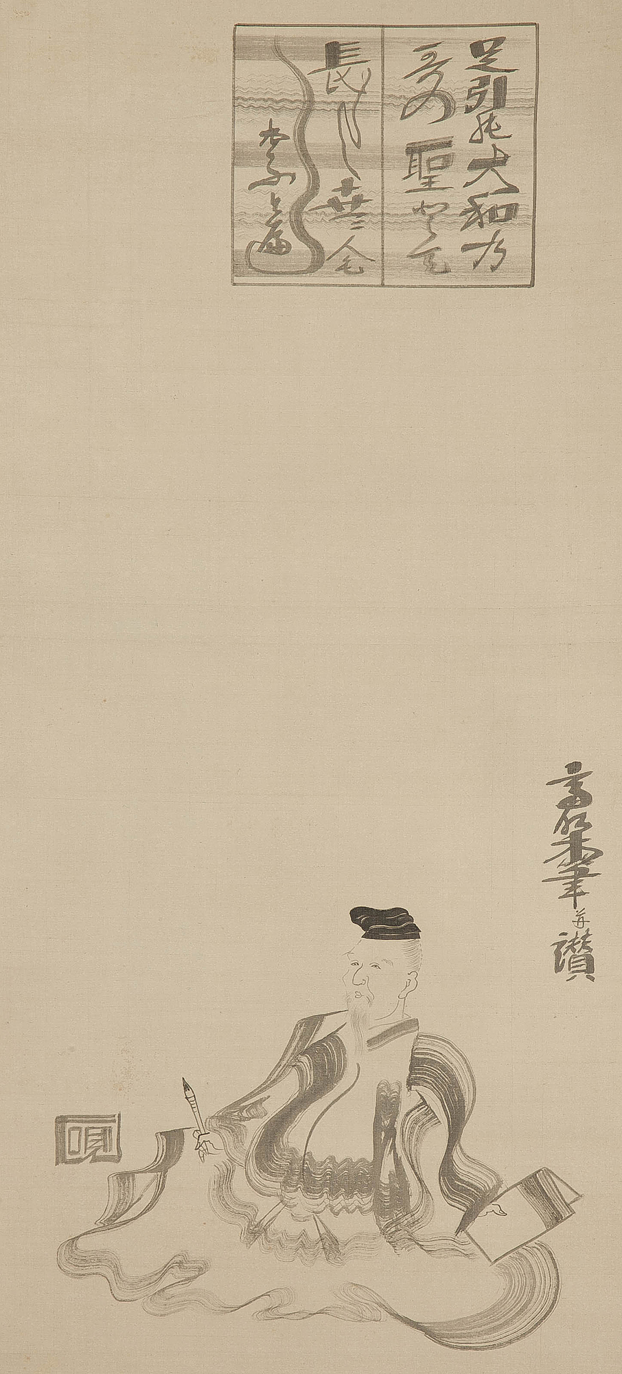 【五】徳川斉昭(烈公・景山) 柿本人麻呂像画賛 絹本 墨 掛軸 箱付 真作 收藏
