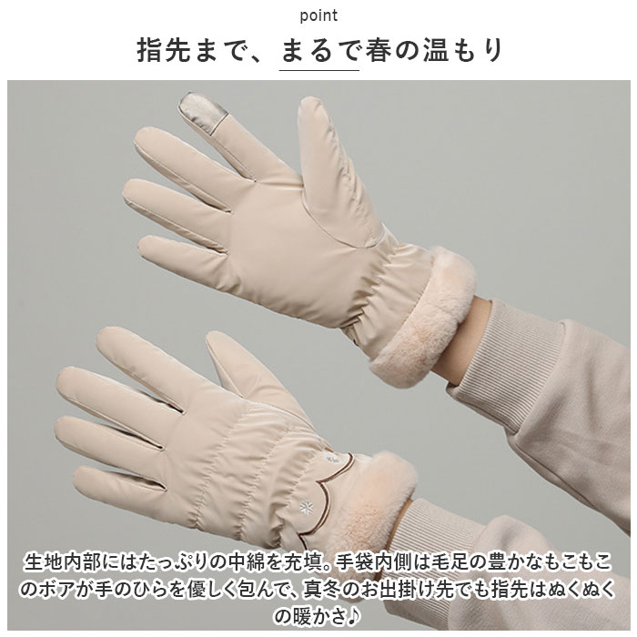 | 商品説明 | ・・木枯らしが吹く日も、もこもこのあったかヴェールで指先ぽかぽか♪コートの手元がパッと華やぐ「レディース ふわふわ防寒手袋」が新登場。 ・【指先まで、まるで春の温もり】 ・生地内部にはたっぷりの中綿を充填。手袋内側は毛足の豊かなもこもこのボアが手のひらを優しく包んで、真冬のお出掛け先でも指先はぬくぬくの暖かさ♪ ・【冷たい風をシャットアウト】 ・手首折り返しの縁取りは、うさぎの背中みたいにふわふわのフェイクファー。手袋の中の暖かな空気を逃がさず、冷たい風や雪の侵入もシャットアウト。 ・【手袋をしたままスマホ操作OK!】 ・右手人差し指の先端部分に特殊な導電素材を使用することで、スマホ操作に対応。凍える寒さの屋外でも、手袋を着けたままタッチ&スワイプが可能に! ・【サッと装着、脱げ落ち防止】 ・手首や手の甲のゴムギャザーを程よく伸ばせば、ボア生地の間に手のひらがするりと入って装着スムーズ。脱げ落ちにくいでの外出先でも安心。 ・【水滴を弾くはっ水加工生地】 ・ベルベットのようなほのかな光沢と、しっとりとした肌触りが特徴の微起毛生地には、水滴を玉のように弾くはっ水加工済み。普段のお出掛けにはもちろん、スケートなどのウィンタースポーツやお子さまとの雪合戦も一緒に楽しめる!(※完全防水ではありません。長時間水に濡れると、次第に水が生地に染みこむ場合がございます。) ・【手元から優しい春色に】 ・寒さの中でひっそりとつぼみをほころばせる野の花のような、優しいくすみカラーのバリエーション。手の甲のスカラップフリルに小さくあしらった、雪の結晶の刺繍が控えめなワンポイント。(※一部ベーシックカラーの商品もございます。) |