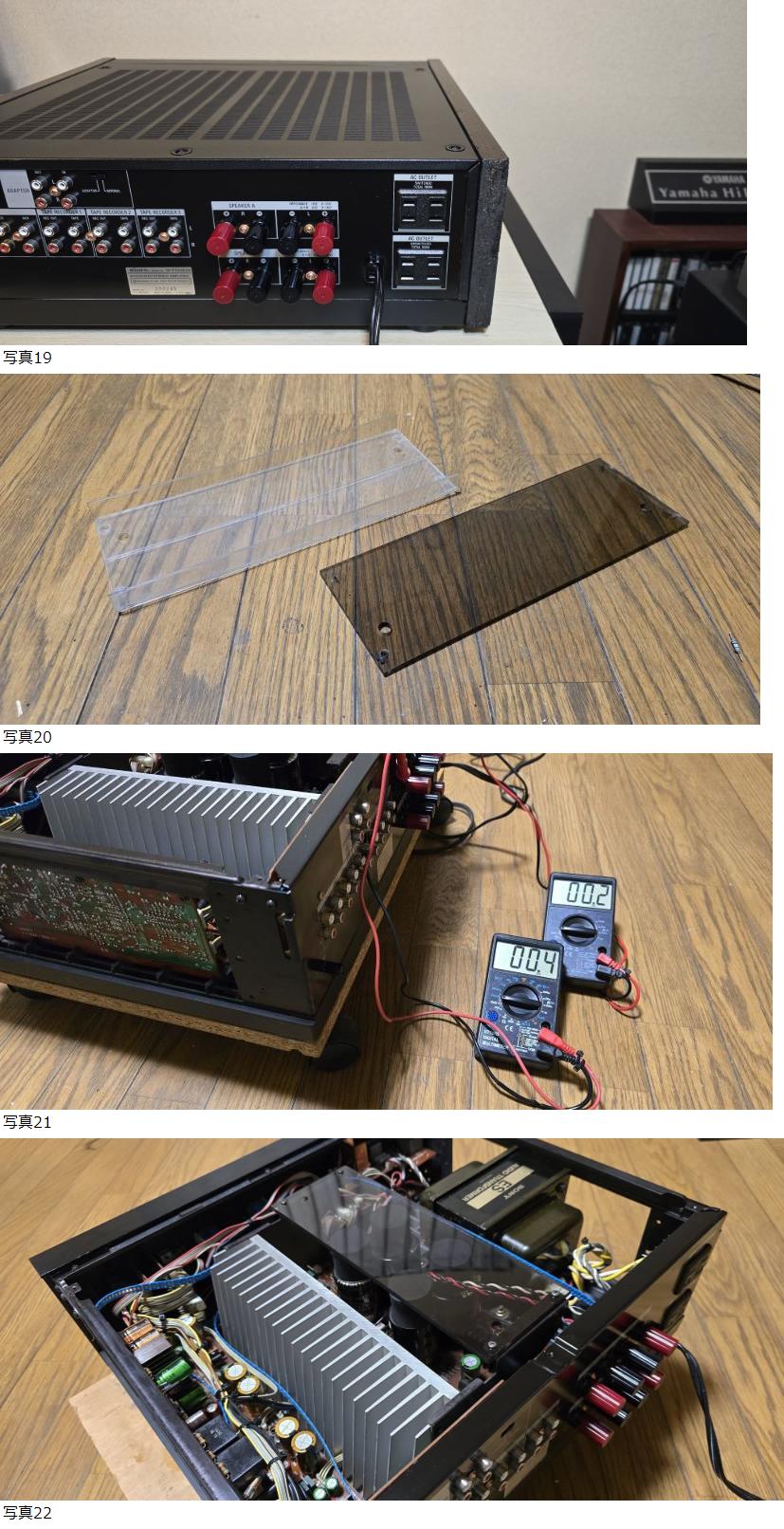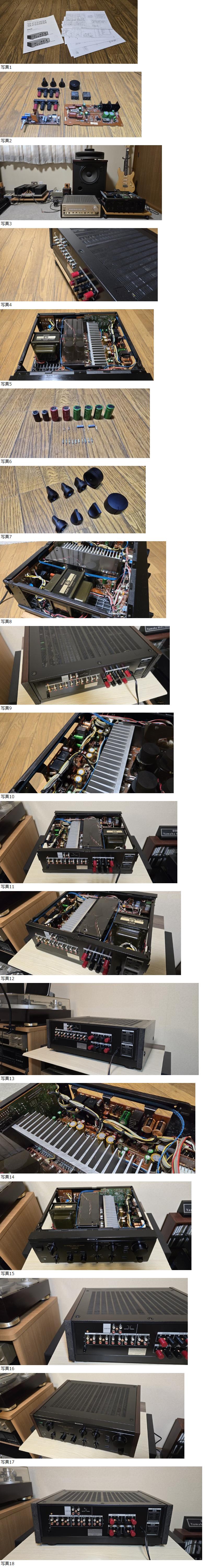 | 商品説明 | ●末永く修理、メンテナンスをさせて頂きますので、安心してご入札してください! ●修理交換部品はストックしてあるため、長期的に対応出来ます。 ※特にウィークポイントの部品を交換してある本機は、未整備のアンプを購入、後々必ず故障が発生して高額の修理費用を払うよりも断然お得です。 ●このアンプは、純正本来の高音質変化/劣化/修理を避けるために、ウイークポイントの部品を交換後、当方オリジナルの特殊な方法で、メーカーサービスマニュアルに従い整備を実施してあります。 ※過去オーディオメーカー技術部に所属、その経験と知識を活かした整備/修理/チューニングをフルに発揮して、対応させて頂きます。 ※ノーマル/オリジナル機から、チューニング/改造のアンプまで整備、製作対応しております。 ご要望があればご連絡ください。 改造内容は、基本回路は変更せず、付帯部品交換、回路パターン増強等、オリジナル音質は変わらない様にチューニングします。 ●説明 以下、当方の定型文に手を加えての簡易説明になります。 必ず最後までお読みください。 ●回路構成がシンプル&ストレートを追求した構成となっており、アンプ回路がフォノ・イコライザー部とパワーアンプ部だけのシンプルな構成のプリメインアンプ TA-F333ESXです。 ※無振動・無共振設計を追求したGシャーシを採用 ※電源部には350VAの大型トランスとSTD電源方式を採用 などのスペックです。 ●前期型の初期ロット内容 ※TA-F333ESXシリーズ初号機のそれも希少な前期型初期ロット品です。 ※前期型の初期ロット品(俗に前期型のさらに初期前期型)で、後の通常前期型との違い ①プリ基盤(Aクラス基盤)上のダイオード2個が、LED(発光ダイオード)で、当時流行った見た目重視の設定 ②電源トランス上部に添付してあるSONY ES オーディオトランスフォーマーロゴがビニール製ステッカー ※コストが掛かるため後に紙ステッカー製に変更されましたが、剥がれやすいのが欠点 ③電源トランス本体色がガンメタ ③内部配線色がカラー配線 ※コストが掛かるため、後に黒色単色配線に変更 ④電源トランス~Gシャーシ間アース線接続 ⑤アース線がコネクタ無し2本ケーブル~RCA基盤に直留め ●内外装 ※フロントパネル上部、サイドウッド下部角に傷みがあったので修正しておきました。 ※他は概ね綺麗な個体です。 ●使用頻度 ※内外装部共に美品機に仕上げましたが、40年前のアンプの為、使用頻度は不明です。 ※古い工業製品は不特定多数の人達の手を渡り使用されているのが通常で、車の様に物的証拠を提示出来るオドメーター/走行距離表示の機能が無いため、常識的に考えて「使用頻度不明」が正しい表記になります。 ●使用僅少/整備済みアンプの見分け方 ※ヒューズ抵抗値を計測、規定値よりも1割以上数値が上がっていた場合、使用過多で、使用僅少のアンプではありません。 ※ヒューズ抵抗は使用頻度に応じて抵抗値は必ず上昇します。 (計測必要ヒューズ抵抗 100Ω 1/2W ×8個、120Ω 1W ×2個、470Ω 1/2W ×2個) ※他方、トランジスタのhfE測定、並びに電解コンデンサの容量低下/容量抜け/容量オーバーを計測 ※共に使用僅少アンプの場合、各数値の変動が少ないのは当然です。 ※整備済みアンプの確認もお勧めします。 オフセット調整/バイアス調整済みと明記してある場合、実際にテスターで値を確認してください。 特にDCオフセット値はスピーカー端子にテスターを接続して簡単にDC漏れの確認が出来ます。 値が限りなく0に近いのは、調整済みアンプなら当然で、数値が大幅に大きい場合は未調整でDC漏れの証拠になり、スピーカー破損の危険性があります。 ※大抵、調整中の画像が無い場合は未調整品=詐欺アンプで、今現在!では数多く見られます。 ※一般の人は内部の確認、電気計測等出来ないのをいいことに、長文の説明でうまい話ばかり載せ自画自賛している輩も見受けられます。 そのような場合は、画像確認及び整備/調整中の画像が無い出品物については、突っ込んだ質問を出品者にしてください。 出品アンプは使用頻度の少ないと記載してあるが、電圧調整中の画像や使用頻度の少ない物的証拠を何故載せないのか?と。 兎に角、自画自賛の長文ばかり載せているのはよくある詐欺の常套手段です。 修理をしている出品者にしてみれば、説明文を読めば詐欺と分かる内容です。 ※タイトルのみで物的証拠を提示せずに偽って出品した場合、詐欺罪になる可能性があり、最悪不当景品類及び不当表示防止法違反で処罰されます。 ※★使用僅少(使い回しの画像/虚偽説明文)、美品 徹底分解メンテナンス済 北海道出品者 タイトル詐欺にご注意を! ●整備/改造内容 ※以下、サービスマニュアルに従い整備/コストを掛けてチューニングを実施してあります。 1、徹底分解後内部埃の除去・清掃 2、各基盤洗浄(ハンダフラックス除去) ※画像参照 3、DC0Vオフセット値調整 ※画像参照 4、バイアス値をメーカー規定値15m