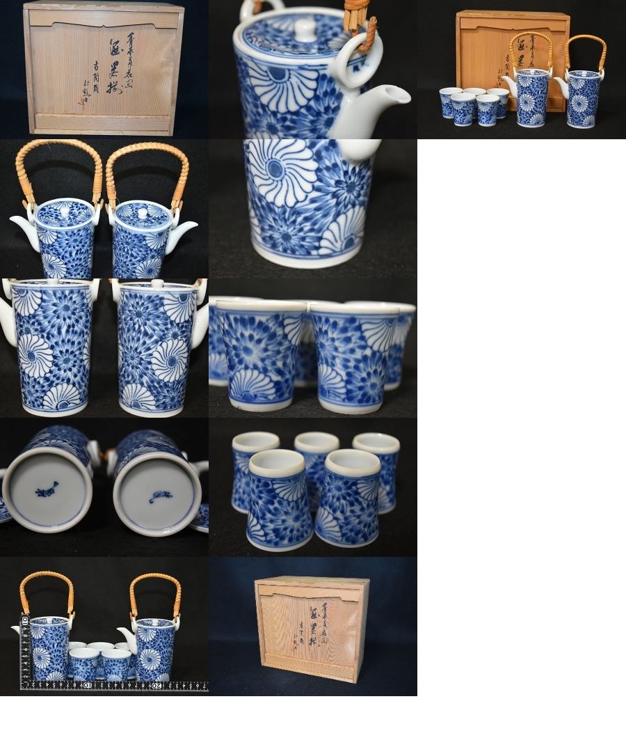 【光成】古陶園・竹鳳作「染付・菊花文・藤巻堤手・酒器揃」未使用・全印刻⑤