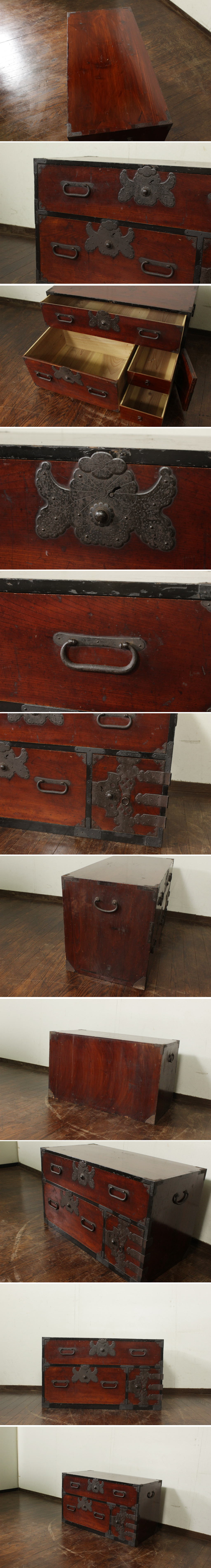 | 商品紹介 | 古い庄内地方の衣装箪笥です。 おそらく明治時代頃のものと思われます。 引き出し前板には欅材の突板が使われています。 錠金具は菊花紋、引手は軍配型の意匠です。 扉付き四杯の引き出しレイアウト。 和レトロな雰囲気があり、 実用はもちろん、ディスプレイやインテリアにもおすすめです。 |