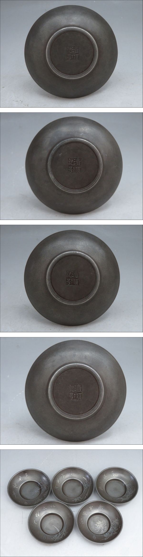 ◆◇中国古玩 古錫 清順記号 五一銘 五清図 錫製茶托 5客 重量303.9g 五君子 煎茶道具 茶器 漢詩 唐物 ◇◆ 收藏