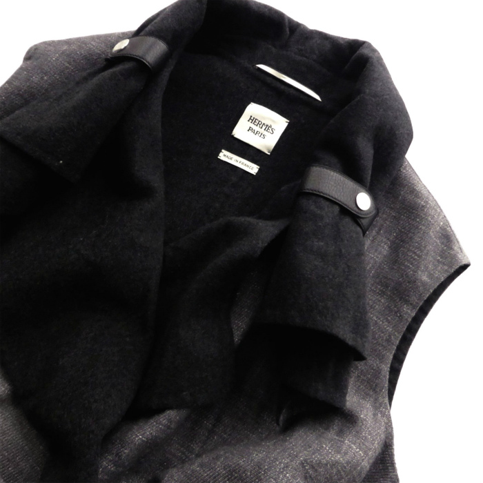 | エルメスのロングジレ。 カシミア、リネン、シルクを使用したドレープ感のあるロングジレ。 縦、横違う糸をを使用しているため生地に奥行きがあります。 カシミアとシルクの柔らかい風合いと、リネンの固さがうまく合わさり独特なドレープ感が魅力です。 襟元はレザー製の留め具で収納可能となっており、スタイリングに合わせて2パターンお楽しみいただけます。 エルメスらしいエレガントなラグジュアリースタイルから、ステルスラグジュアリー等、様々なスタイリングで活躍する逸品です。 |
