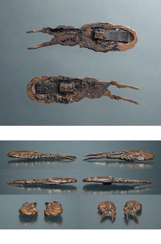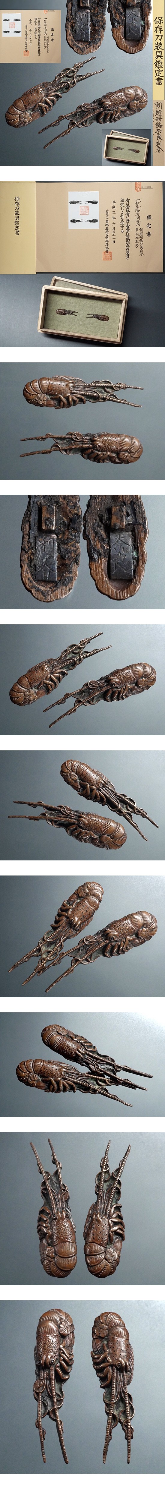 【保存刀装具鑑定書付】割短冊銘 奈良利春在銘「伊勢海老図目貫」細密容彫 特注落し箱入 超絶技巧 日本刀刀装小道具 刀剣外装拵 收藏