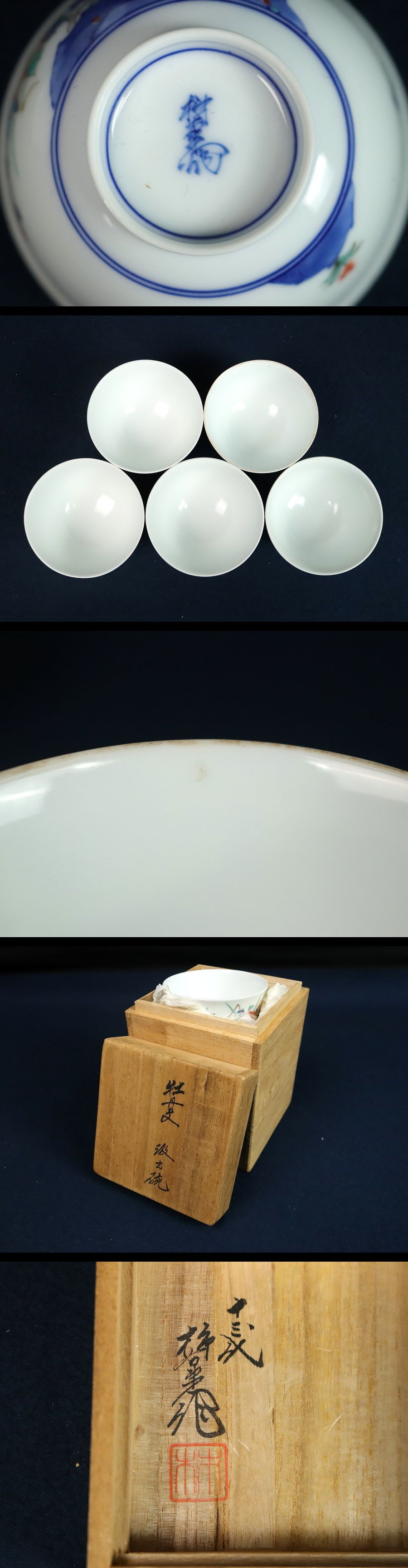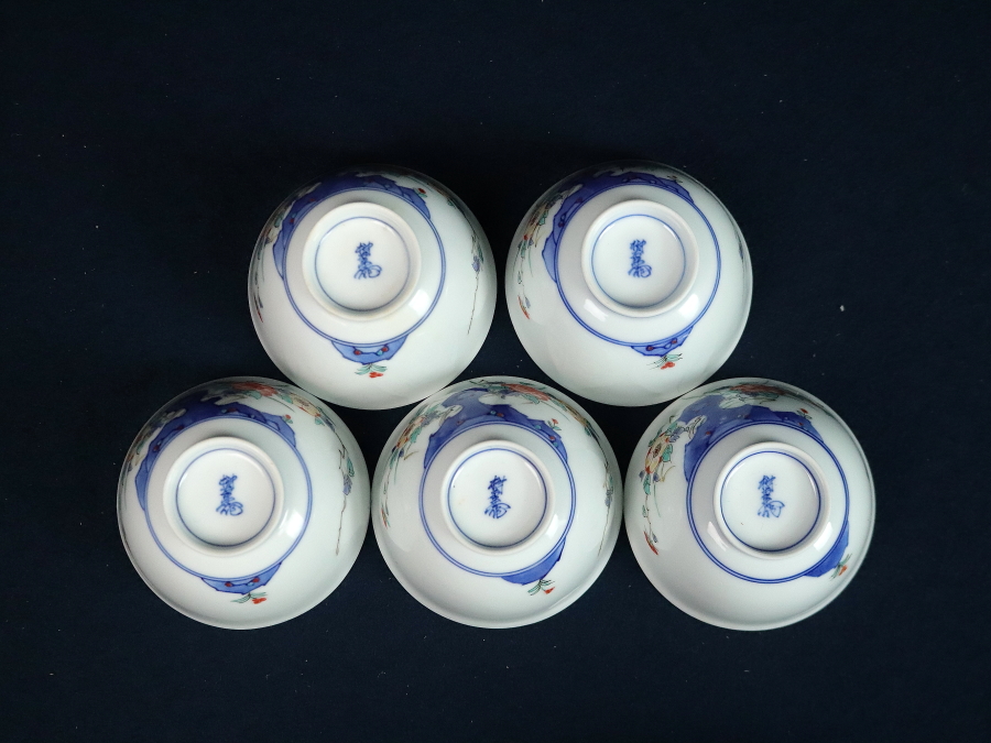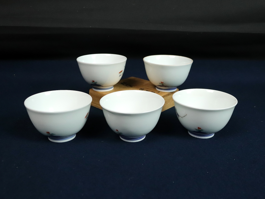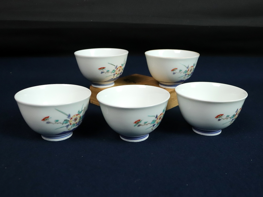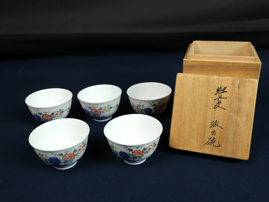 12747■13代 酒井田柿右衛門 牡丹文 汲出碗 5客 共箱 湯呑 陶芸家 人間国宝 茶器 茶道具 煎茶道具 收藏