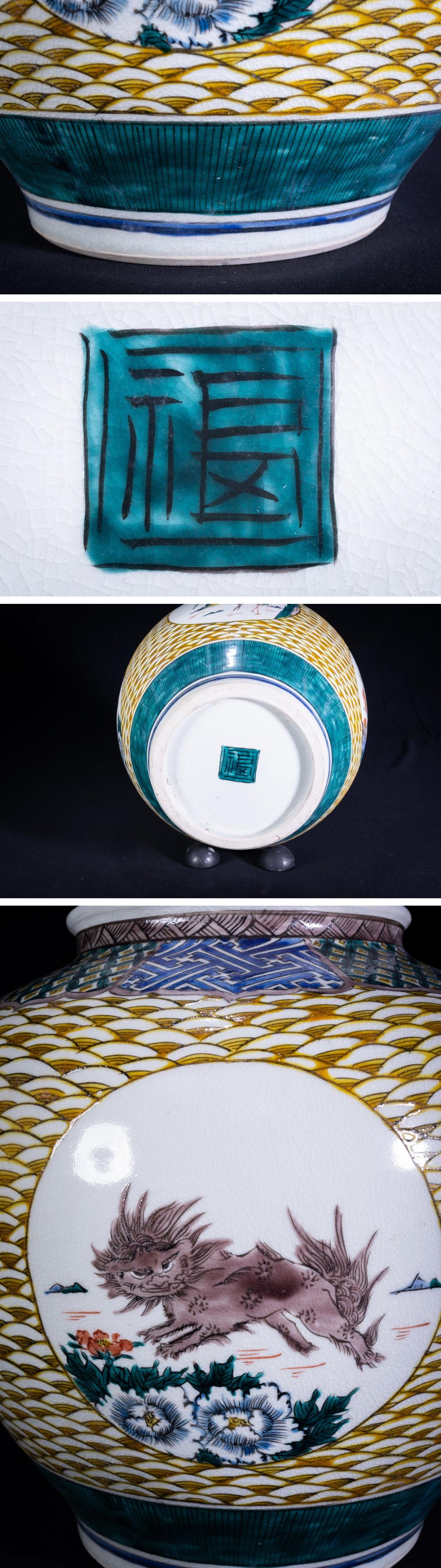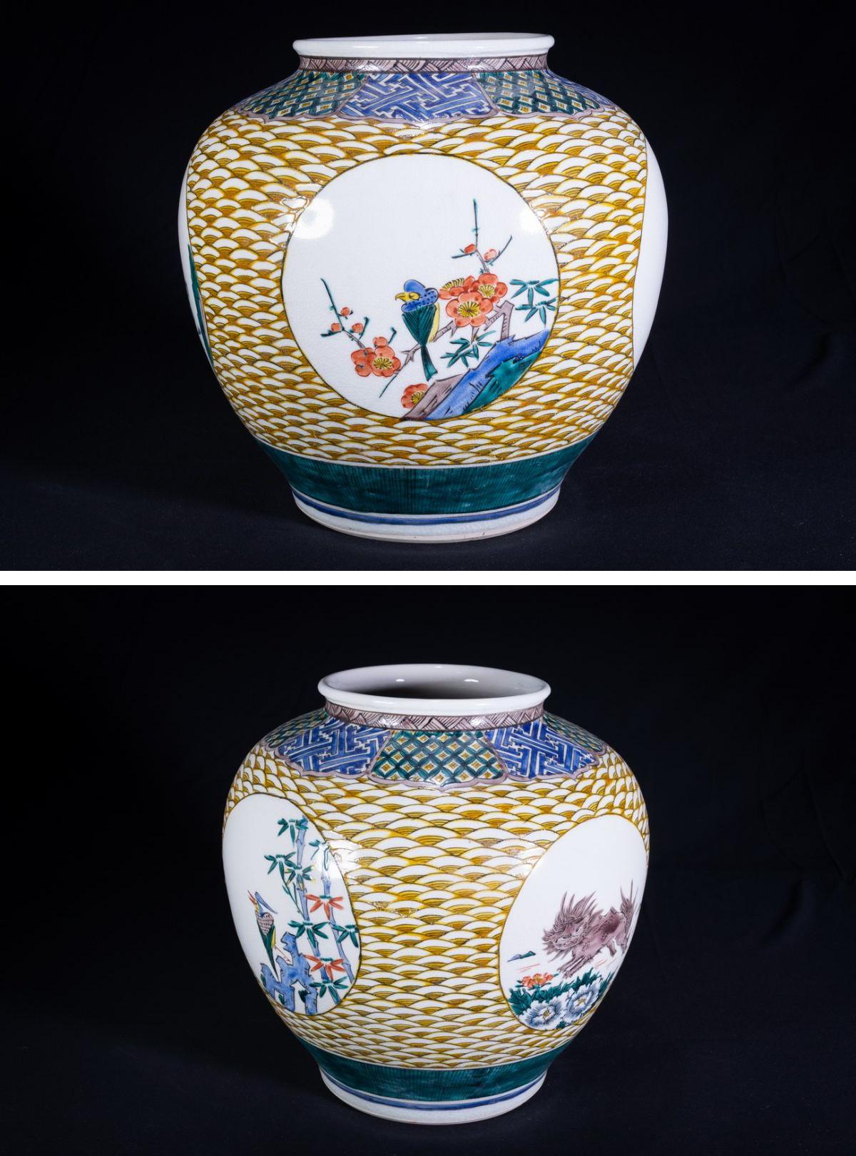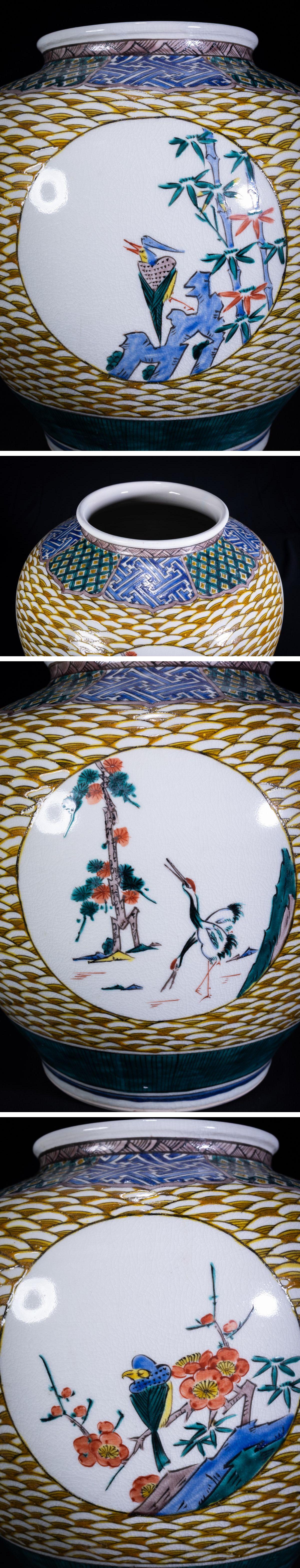【珍品堂】1円から 九谷焼 角福在銘有 波紋花鳥図 花瓶 飾り壺 時代物 古美術 骨董品 H32.5cm M-A8J-F3 收藏