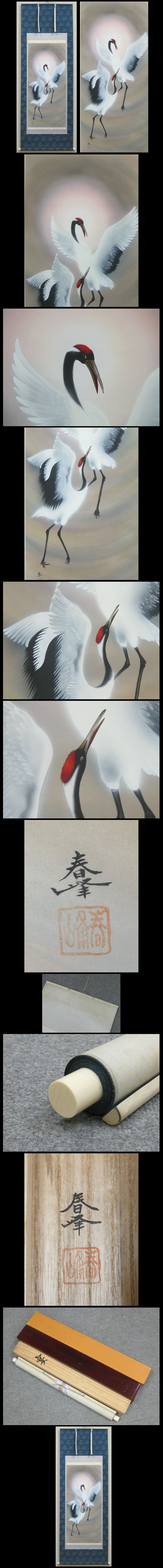 【心庵】掛軸 海野春峰 絹本「宴」双鶴図/肉筆 共箱 二重箱 真作 広島県 B877 收藏