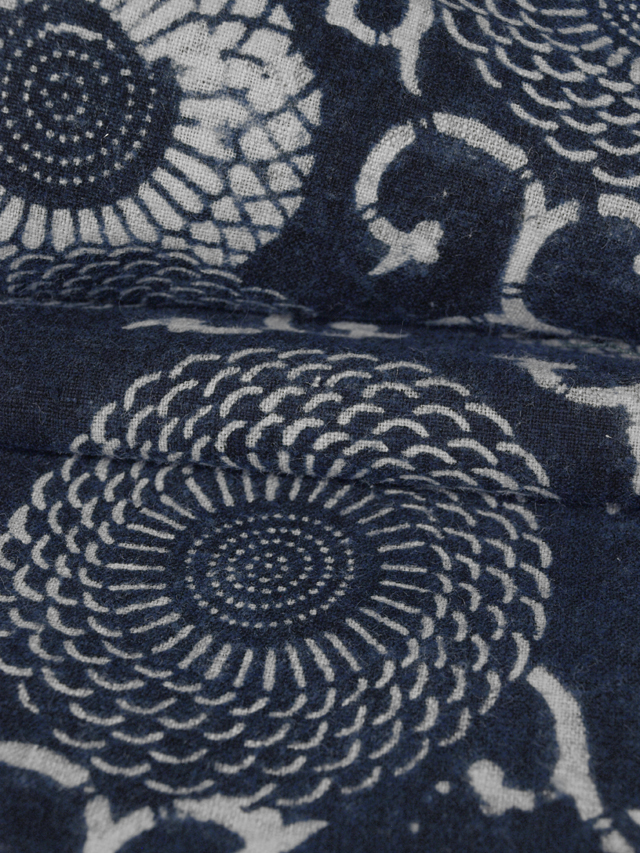 濃藍色の地に、菊唐草の文様が染め抜かれている、綿の型染のはぎれです。両面染めです。 江戸末期ごろにつくられたと思われるアンティークのお品です。ざっくりとした手ざわりの太い糸味がアンティークならではの良い趣を醸しています。両面染めはとても稀少なお品になります。 両耳直近に縫い跡はありますが、そのほかに目につくしみやよごれ、褪色、穴などのダメージはなく、とてもきれいな状態です。生地の力もあります。 |