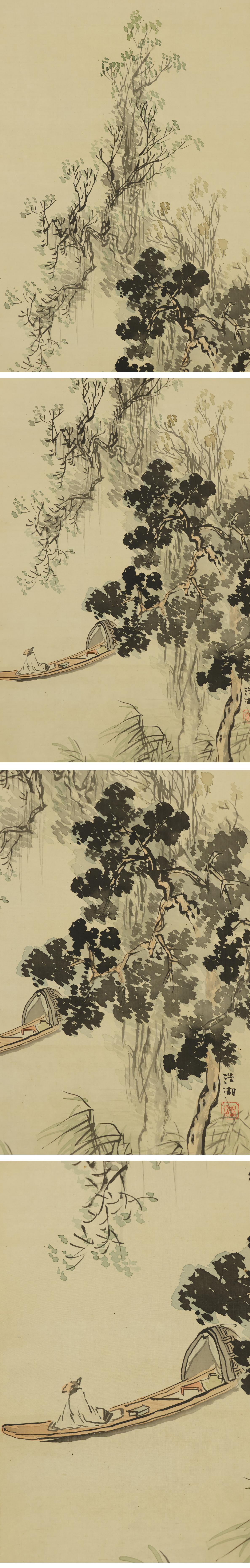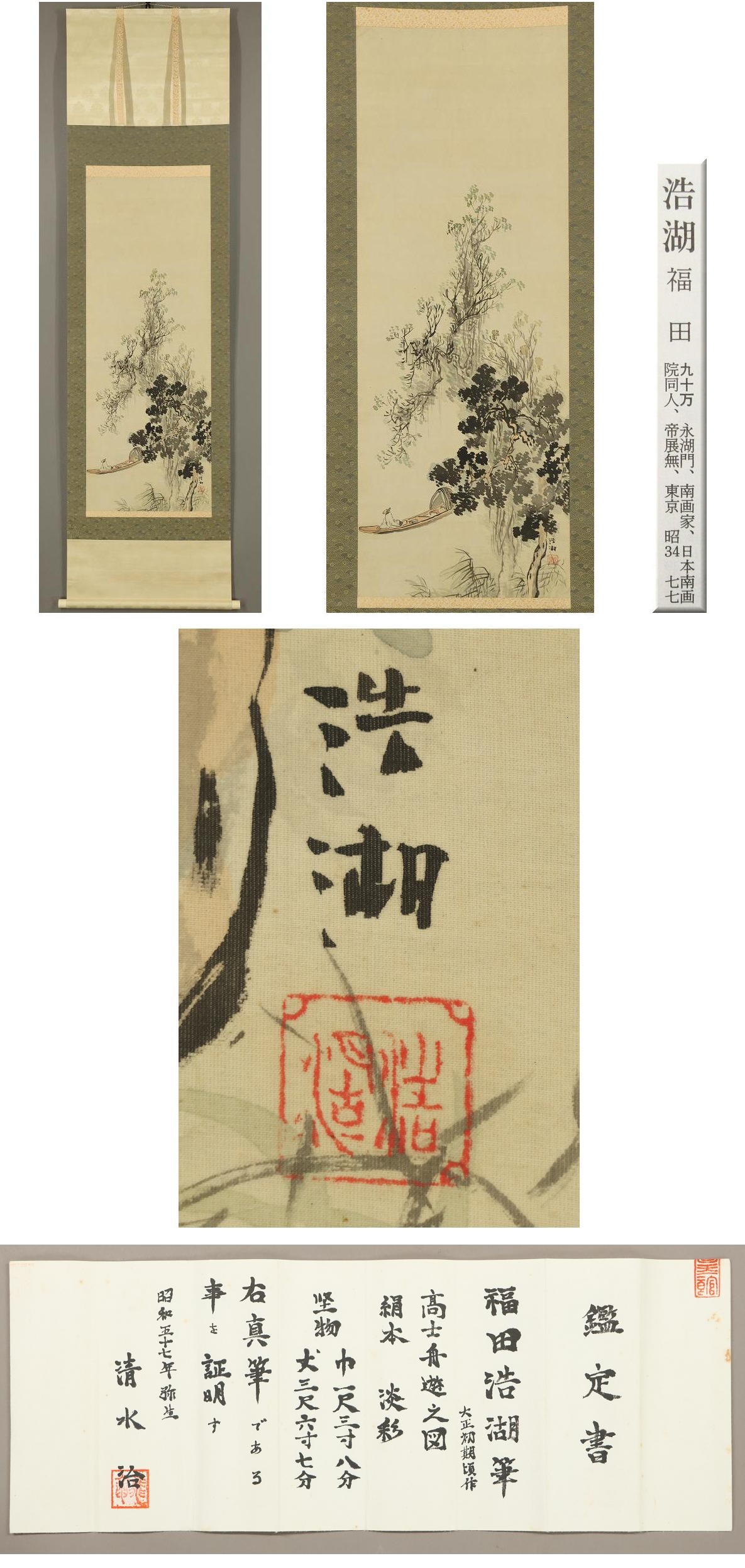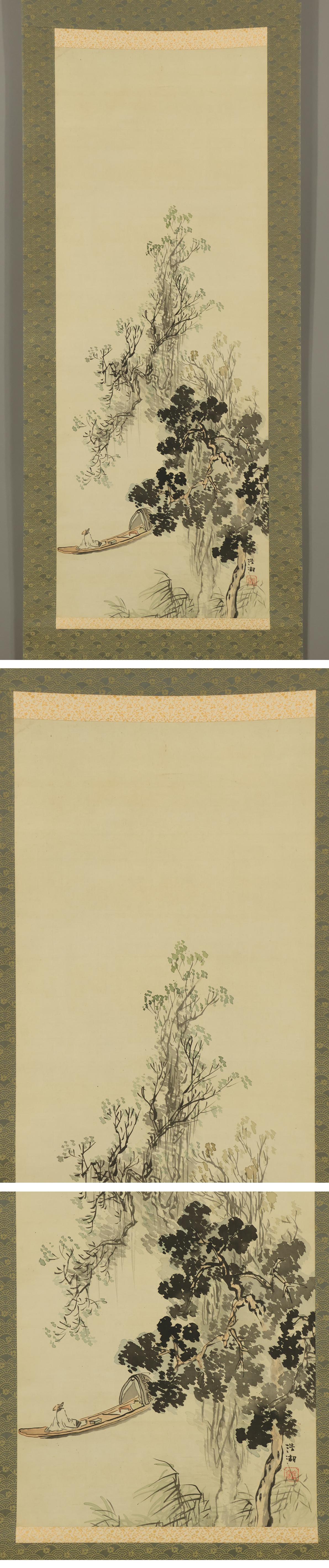 【真作】福田浩湖◆鑑定書付◆高士舟遊之図◆日本画◆肉筆◆絹本◆掛軸◆x343 收藏
