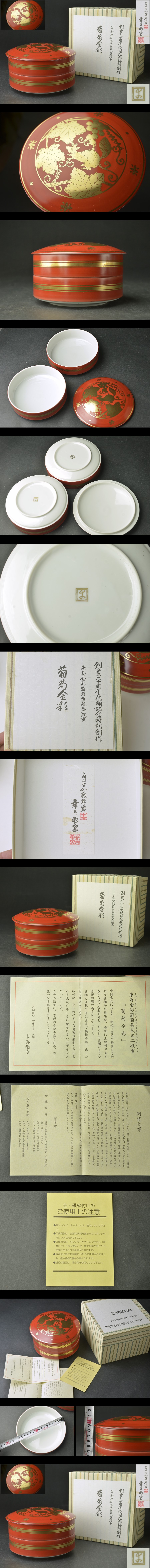 人間国宝 加藤卓男『葡萄金彩 朱巻金彩葡萄栗鼠文二段重』・創業六十周年飛翔記念作品・栞・専用箱★【YB】日本工芸WB02 收藏