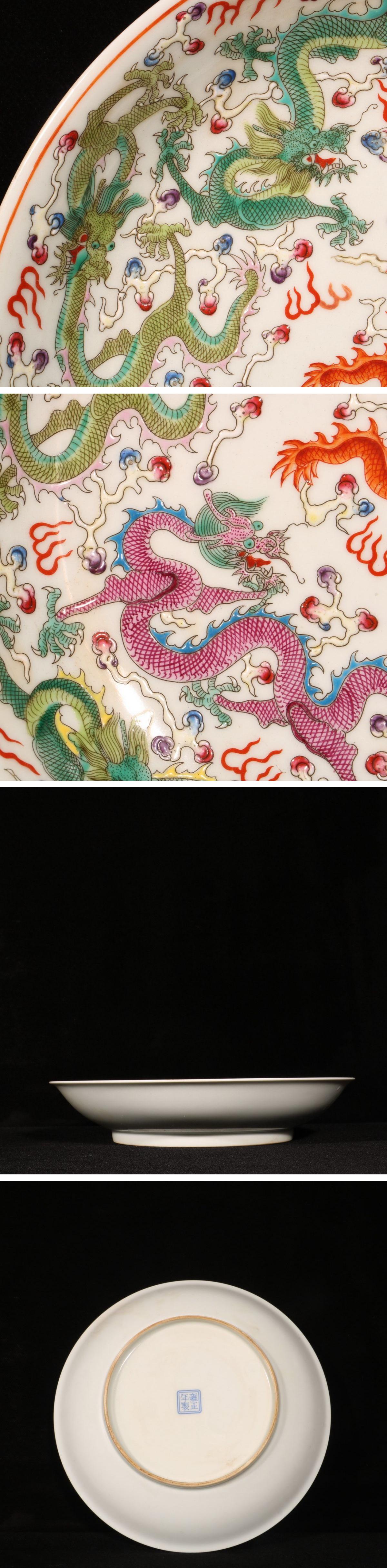 【清】関西某オークション購入 中国伝来 清時代物 大清雍正年製 粉彩九龍紋飾り皿 当時物 時代コレクション8L1-YS3 收藏