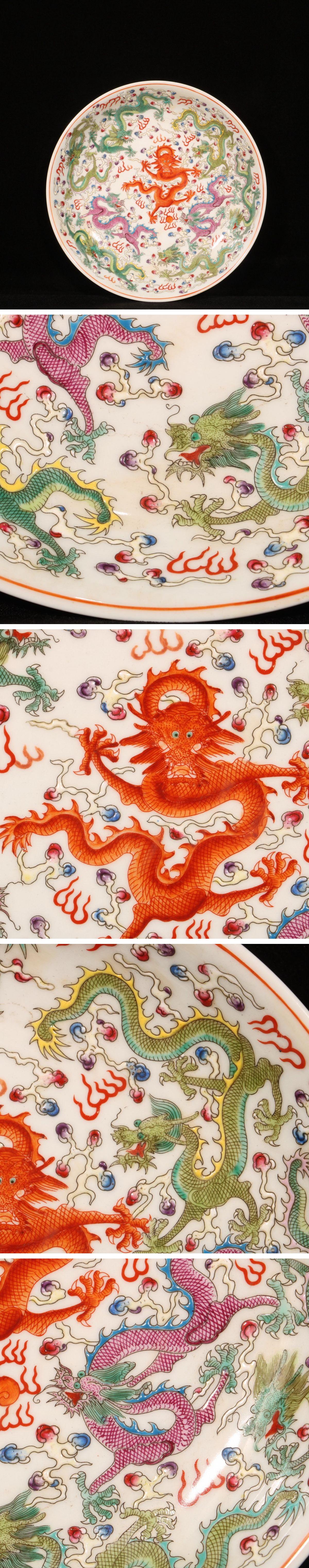 【清】関西某オークション購入 中国伝来 清時代物 大清雍正年製 粉彩九龍紋飾り皿 当時物 時代コレクション8L1-YS3