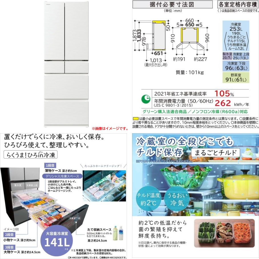 【商品特長】 ◆「らくうま!ひろin冷凍」「まるごとチルド」「新鮮スリープ野菜室」を採用した冷蔵庫(485L)。 自動で素早くおいしくホームフリージングができる。 ◆冷蔵室全段がチルド保存で、やや低めのチルド温度(約2度)とうるおい冷気で鮮度が長持ちする。 「冷蔵室独立冷却システム」でしっかり省エネを行う。 ◆急いで冷やしたいときに便利な「クイック冷却」、 乾燥を抑え凍らせない約-1度で肉や魚をおいしく保存する「特鮮氷温ルーム」を搭載。 | |||||||||||||||||||||||||||||||||||||