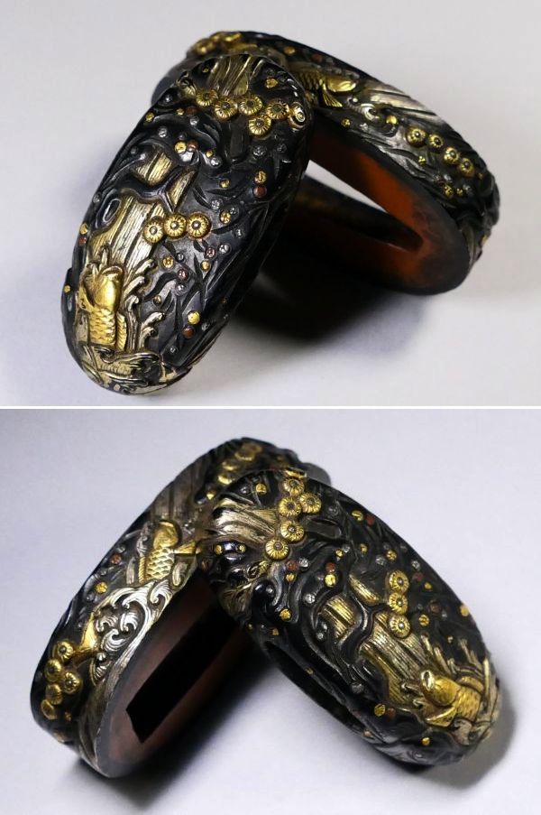 | 商品説明 | 華やかな金銀色絵に 見応え抜群の迫力ある 鯉の滝登り図が施された 材質・細工共に上手の一品です。 作行から見て 後藤系統の優品と推測しております。 詳しくは画像にてご確認下さい。 拵え栄え抜群の一品と存じます。 この機会に是非手に入れて下さい。 【赤銅:上質】 【上手の細工技術】 【拵え栄え抜群の一品】 寸法: (縁) 約 3.78cm × 約 2.10cm × 約 0.92cm (厚み) (頭) 約 3.42cm × 約 1.67cm × 約 0.63cm (厚み) 時代: 江戸時代 材質: 赤銅地 桐箱付 銘 : 無銘 状態:特に気になる傷みはなく良好。画像にてご判断下さい。 :許容範囲内の時代傷みはご理解下さい。 |