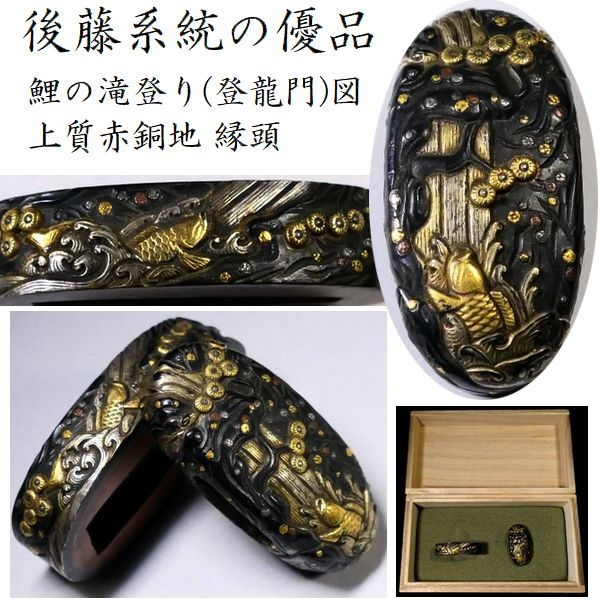 【刀装具 #3646】 (縁頭) 後藤系統の優品 見応えある鯉の滝登り(登龍門)図 上質赤銅地 縁頭 【材質・細工共に上手の一品です】 收藏