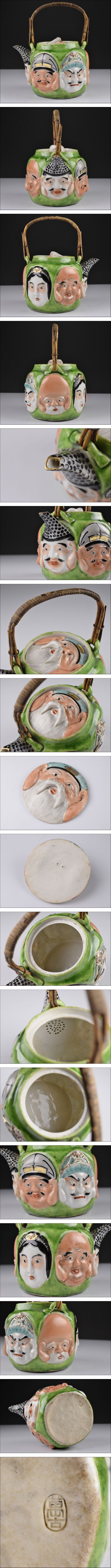 | 品 名:萬古焼 時代 色絵 七福神面 急須 水注 茶道具 寸 法:高さ 17㎝ 幅 14㎝×11.7㎝ 総重量:318g 状 態:傷など無く良品でございます。 | |||