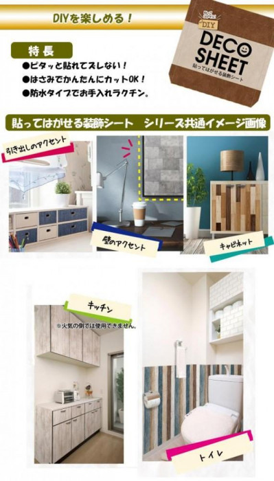 | のり残りなしではがせる日本製の装飾シートです。貼りやすい大きさにカットして使用できます。防水性に優れているので、キッチンや床、壁など自分好みに変えたいという方におすすめです!! ※本製品の性質上、パターンマッチング(柄合わせ)は出来ません。 ※印刷品の為、生産ロットにより多少色目の差が生じる場合があります。 ※こちらの商品は机やテーブルの上への貼り付けには適しておりません。 |