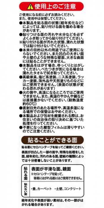 | 素材・材質 | ・表面:塩化ビニル樹脂 ・中間層:ポリエステル ・粘着剤:アクリル系樹脂 ・離型フィルム:ポリエステル |