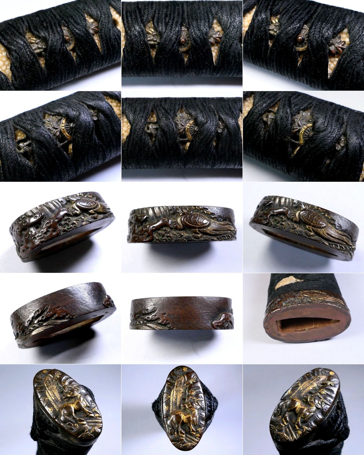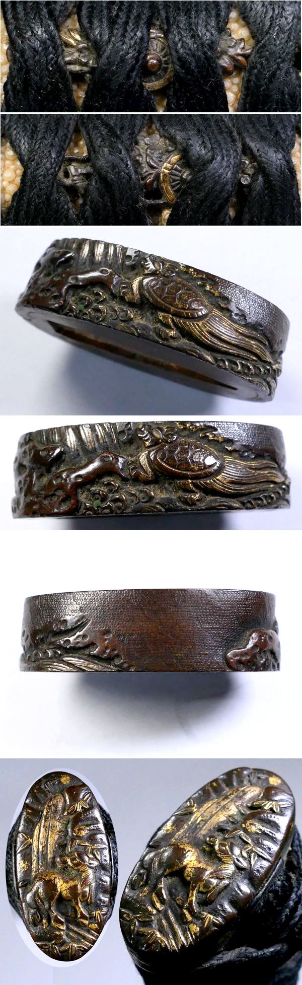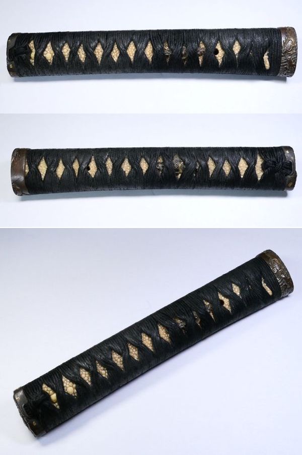 | 商品説明 | ~寸法~ (柄の全長)・・・ 約 22.2cm (縁) 約 3.92cm × 約 2.25cm × 約 1.17cm (厚み) (頭) 約 3.58cm × 約 1.88cm × 約 0.80cm (厚み) (ナカゴ穴の深さ)・・・・ 約 13.8㎝ ※専用の機材がない為、割り箸の棒が入る深さで測っております。概ねの寸法とお考え下さい。 (ナカゴ穴の寸法)・・・ (縦) 約 2.27㎝ (最大幅) 約 0.77㎝ 材質:(目貫・頭)赤銅 (縁)赤銅魚々子地地 金工金具付の刀用の柄前です。 目貫は見栄え良き花車図 縁と頭には瀑布に亀・馬がそれぞれ細工されております。 縁と頭は揃いではないようですが 瀑布に動物という同じ構成の図となっております。 詳しくは画像にてご確認下さい。 大切にして頂ける方の元へ届けば幸いでございます。 ~状態~ 状態は画像の通りとなります。 色絵のはがれや多少の小キズくらいはございますので 画像にてご確認下さい。 許容範囲内の時代傷みはご理解下さい。 |