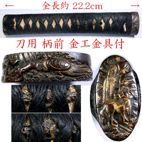 【 恵 #2023 】 刀用柄前 全長22.2cm 金工金具付 目貫:花車 縁:瀑布に亀 頭:瀑布に馬 検:鍔/縁頭/目貫/小柄/刀剣/刀装具 收藏