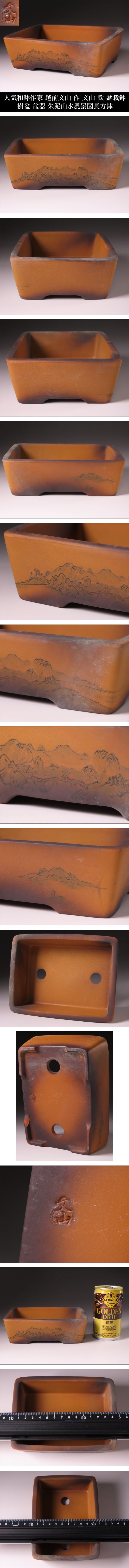 【ONE'S】人気和鉢作家 越前文山 作 文山 款 盆栽鉢 植木鉢 樹盆 盆器 朱泥山水風景図長方鉢 幅14.7cm 古美術品 | |||