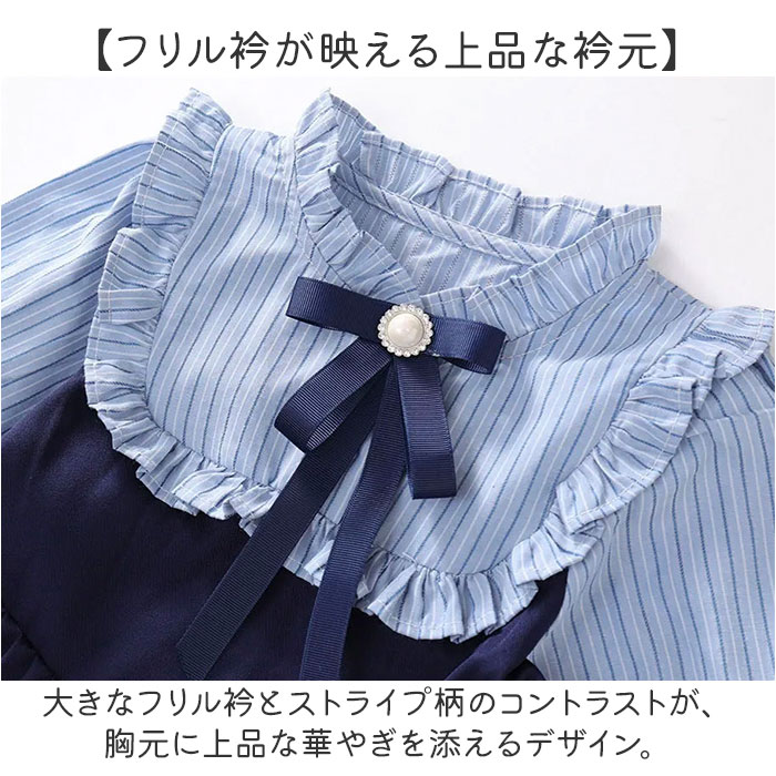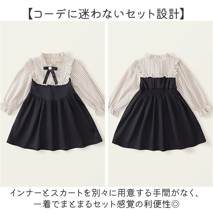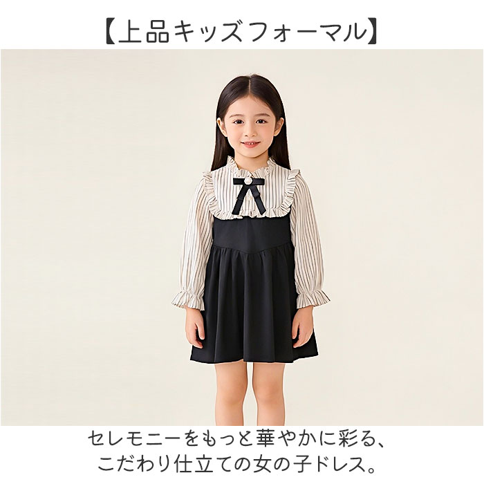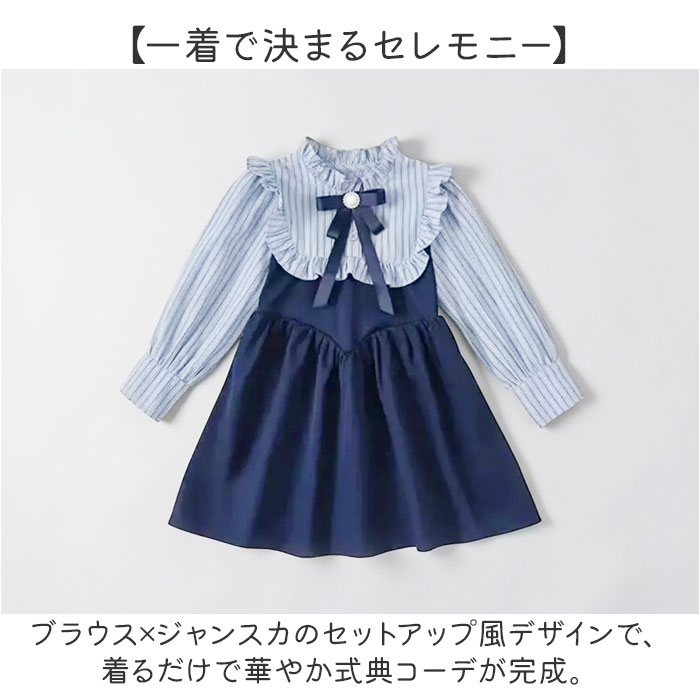 | 商品説明 | ・・【上品キッズフォーマル】 ・セレモニーをもっと華やかに彩る、こだわり仕立ての女の子ドレス。 ・【一着で決まるセレモニー】 ・ブラウス×ジャンスカのセットアップ風デザインで、着るだけで華やか式典コーデが完成。 ・【コーデに迷わないセット設計】 ・インナーとスカートを別々に用意する手間がなく、一着でまとまるセット感覚の利便性◎ ・【フリル衿が映える上品な衿元】 ・大きなフリル衿とストライプ柄のコントラストが、胸元に上品な華やぎを添えるデザイン。 ・【取り外せるパールコサージュ】 ・パールビジューを中心にあしらったグログランリボンのコサージュは、着回しにも便利〇 ・【裾フリルで愛らしさをプラス】 ・フロントボタンと裾のフリルデザインが、コーデ全体に女の子らしい愛らしさをプラス♪ ・【長袖で秋冬の式典にも対応】 ・長袖デザインで、肌寒い卒園式やピアノ発表会のシーズンにも対応可能。 ・【バックゴムで動きやすい設計】 ・背面ウエストのゴムギャザー仕様により、成長期のお子様の体型にフィットする快適設計! |