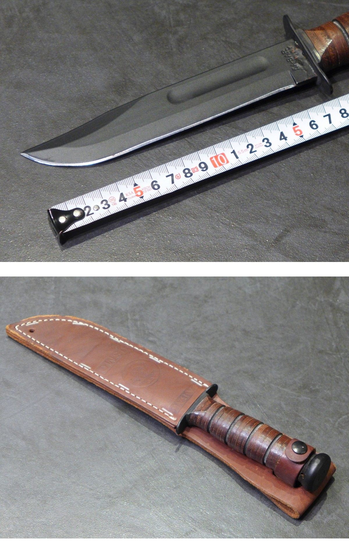 USMC 米海兵隊 ケーバー KA-BAR ファイティングナイフ 専用革ケース入。全長約30cm、革の経年感あり。経年保存品の為、画像をよく見て頂き、状態に了承いただいた方のみの御入札をお願い致します。