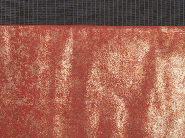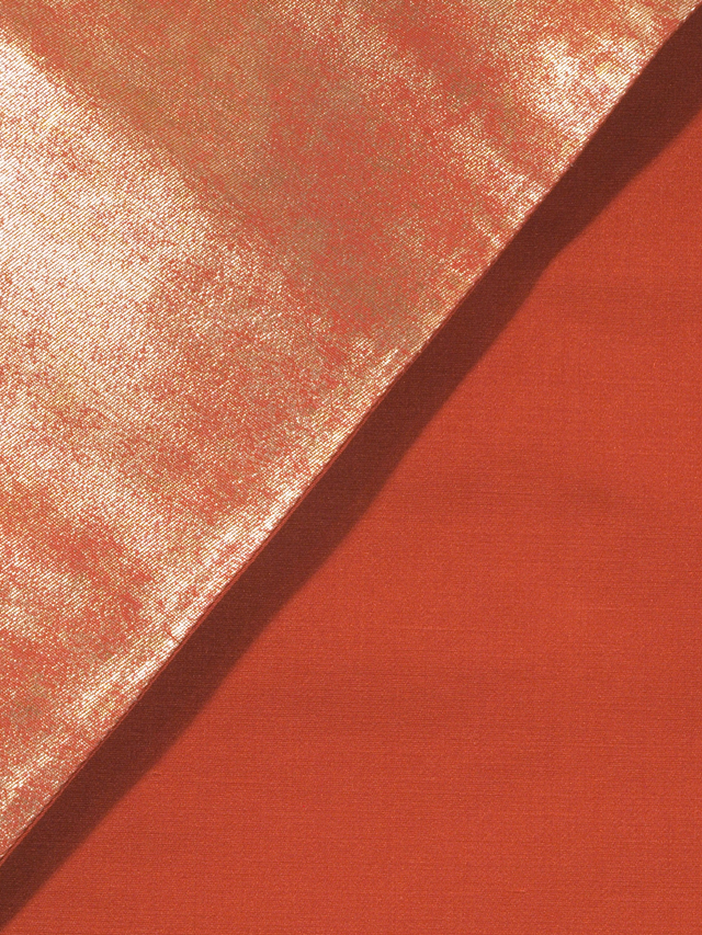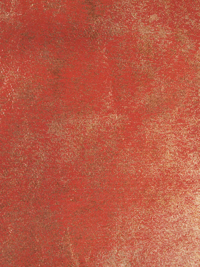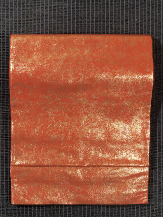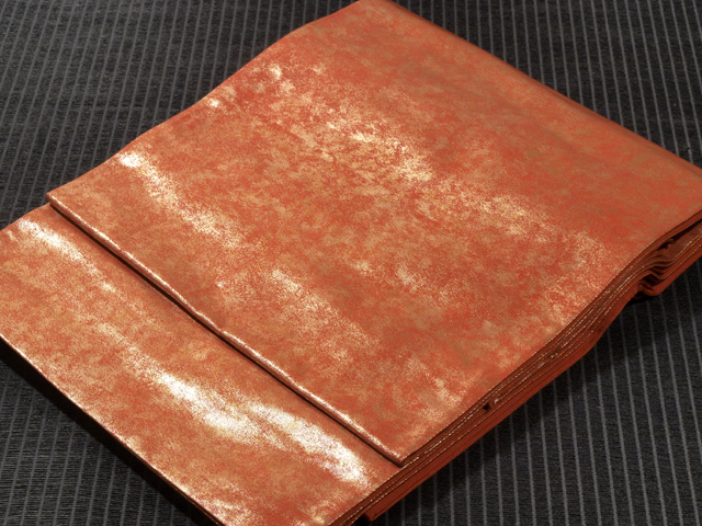やや沈んだ丹(に)色の地に、やや沈んだ金色の引箔で霜降の文様が織り込まれている、西陣織の袋帯です。 シンプルですが、雅びな雰囲気です。金箔は鈍い光沢で、嫌味のない印象です。 ユーズド品で、うっすらとした前の折り跡と結びじわがあるほか、うっすらとしたこまかなしわが全体のところどころにあります。目につくしみやよごれ、褪色などのダメージは見あたらず、きれいな状態です。 |