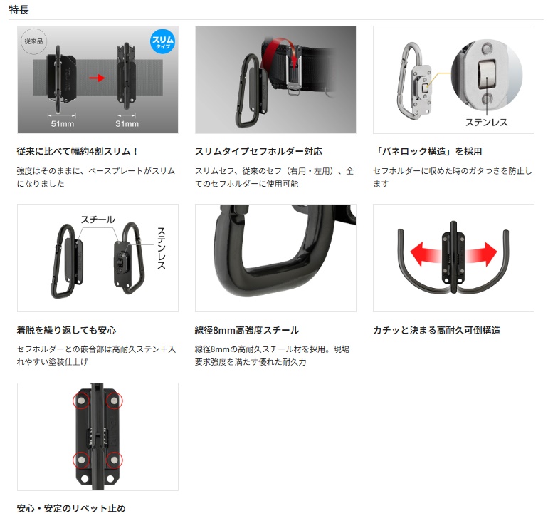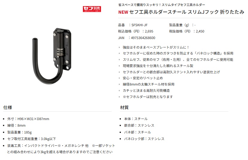 タジマ TAJIMAセフ工具ホルダースチール スリムJフック 折りたたみ品番流通コードSFSKHI-JF■特長・強度はそのままベースプレートがスリムに!・セフホルダーに収めた時のガタつきを防止する「バネロック構造」を採用・スリムセフ、従来のセフ(右用・左用)、全てのセフホルダーに使用可能・現場要求強度を十分満たした頼れるスチール製・セフホルダーとの嵌合部は高耐久ステン+入れやすい塗装仕上げ・安心・安定のリベット止め・線径8mmの太軸スチール材を採用・カチッと決まる高耐久可倒構造※セフホルダーは別売となります