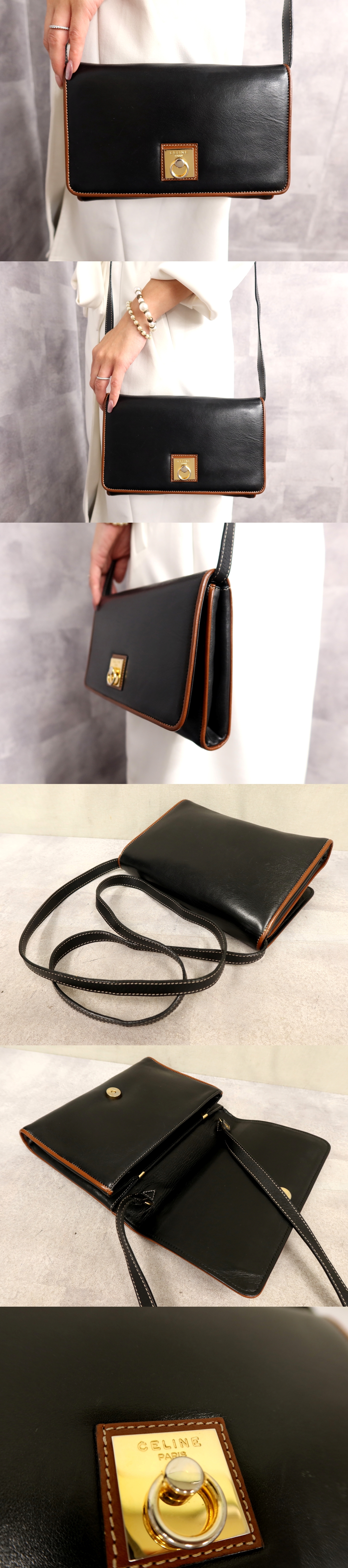 ●超美品●CELINE セリーヌ●ガンチーニ●フラップ●カーフ レザー 本革●ショルダー バッグ●黒 キャメル●ゴールド金具●かばん●Js61924 收藏