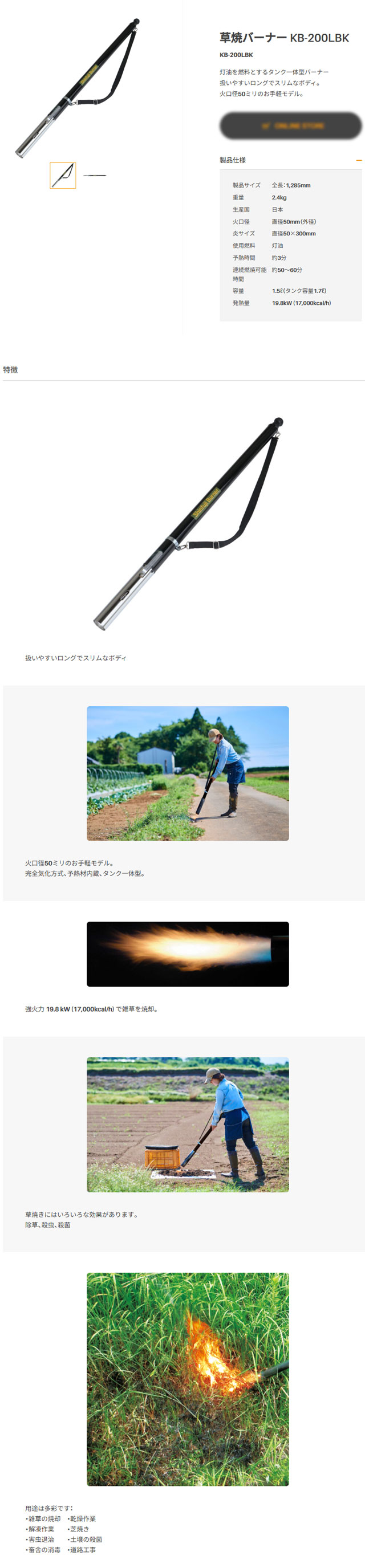 新富士バーナー 草焼バーナー KB-200LBK を出品いたします。 ■特徴■ 灯油を燃料とするタンク一体型バーナー 扱いやすいロングでスリムなボディ。 火口径50ミリのお手軽モデル。 扱いやすいロングでスリムなボディ 火口径50ミリのお手軽モデル。 完全気化方式、予熱材内蔵、タンク一体型。 強火力19.8kW (17000kcal/h)で 雑草を焼却。 草焼きにはいろいろな効果があります。 除草、殺虫、殺菌 用途は多彩です: