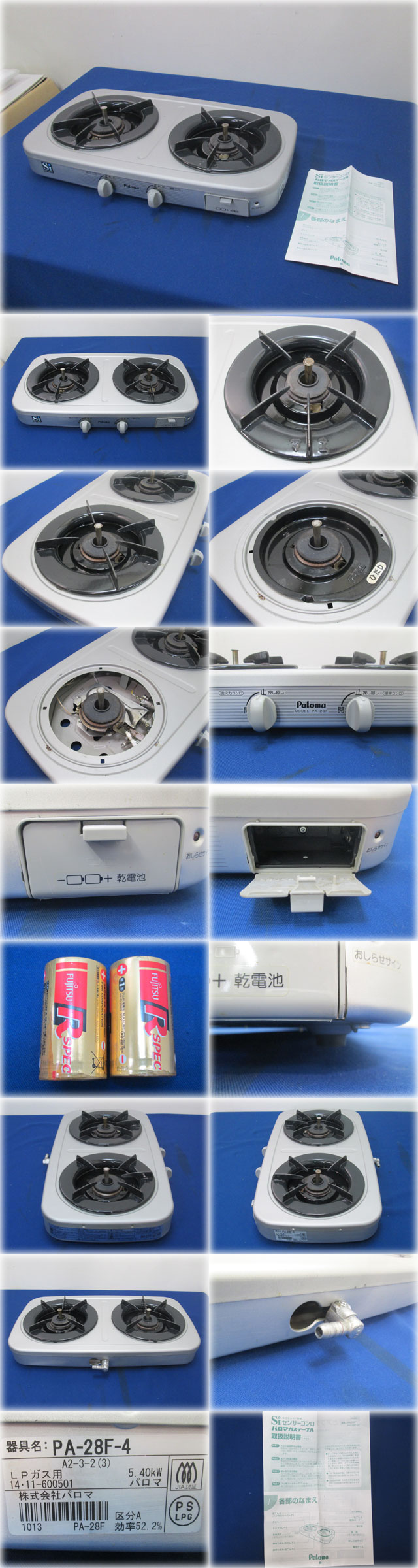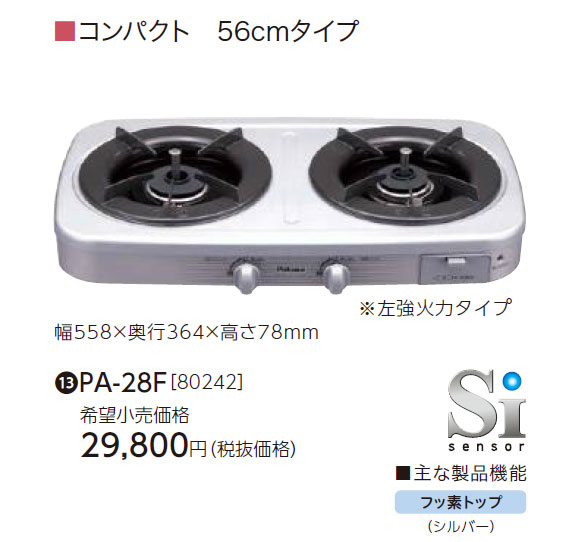 パロマ 2口ガステーブル PA-28F (PA-28F-4) を出品いたします。 ■特徴■ 魚焼グリルを搭載していないタイプです。 フッ素トップ 煮こぼれや油汚れもさっとひとふきで元どおり。 お手入れらくらくです。 Siセンサー すべてのバーナーに搭載した安心・安全機能! すべてのバーナーに「調理油過熱防止装置」 「消し忘れ消火機能」などを搭載! 最新の配慮から数々の安全機能をカタチにしました。 安心・安全にお使いいただくために 温度センサーをすべてのバーナーに搭載しました。 すべてのバーナーで”うっかり”も”しっかり”フォローします。 空焼きなどでなべの温度が急速に上昇すると、 安全のため加熱途中でも火力をいったん弱くし、 異常高温に達しないよう火力を自動制御します。 なべの温度が安全な温度まで下がると 再び強火(もとの火力)に戻ります。 お使いいただく方のあらゆるご使用シーンを視野に入れ、 安全性を向上させました。 最新の配慮から「調理油過熱防止装置」 「消し忘れ消火装置」「焦げ付き消火機能」を すべてのバーナーに搭載して安全性を高めました。 ■仕様■