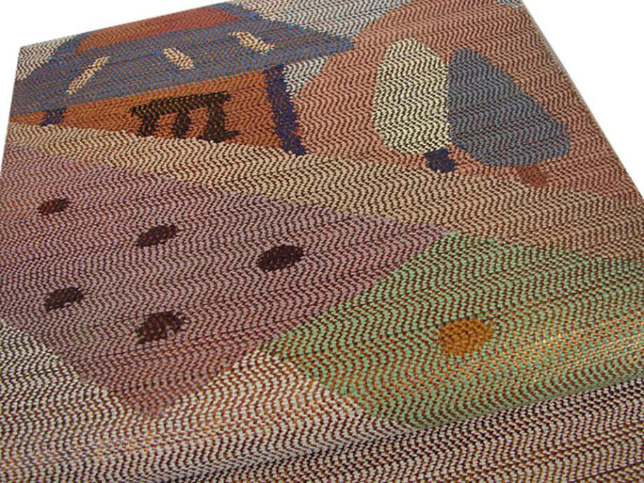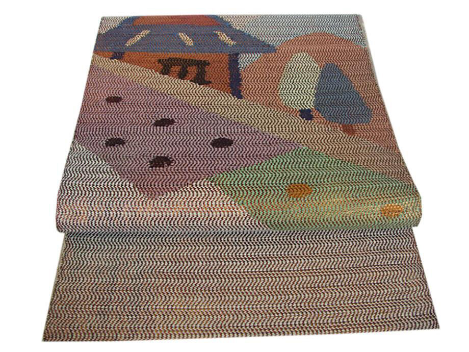 | 商品説明 | しなやかな手触りの〆易く扱い易い紬地の袋帯。 砂色地に金糸や浅紫、松葉、茶、青色等の家屋や立木等の織柄。 たいこ柄。 |