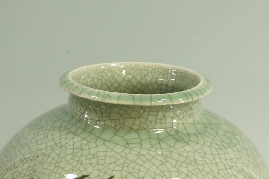 ●相馬焼 吉原銘 駒焼 ヒビ青磁 大壺