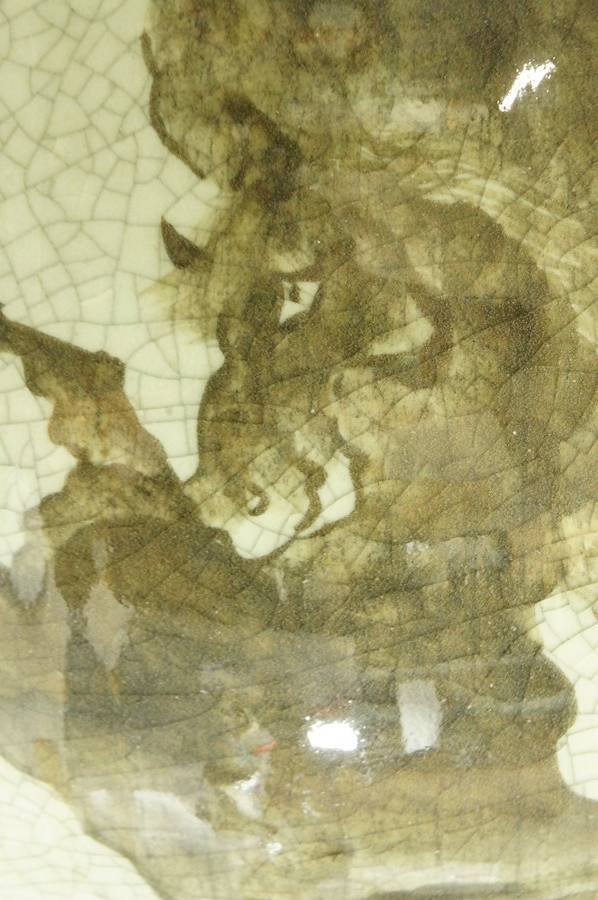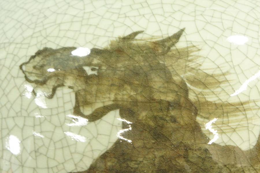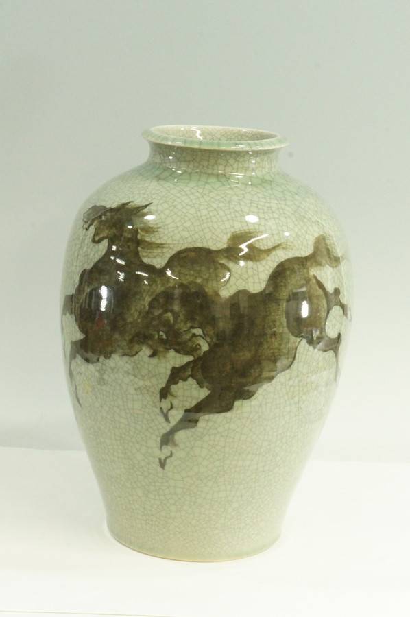 相馬焼の特徴であるヒビ青磁の器体に、馬の絵を大胆に描いた作品です。