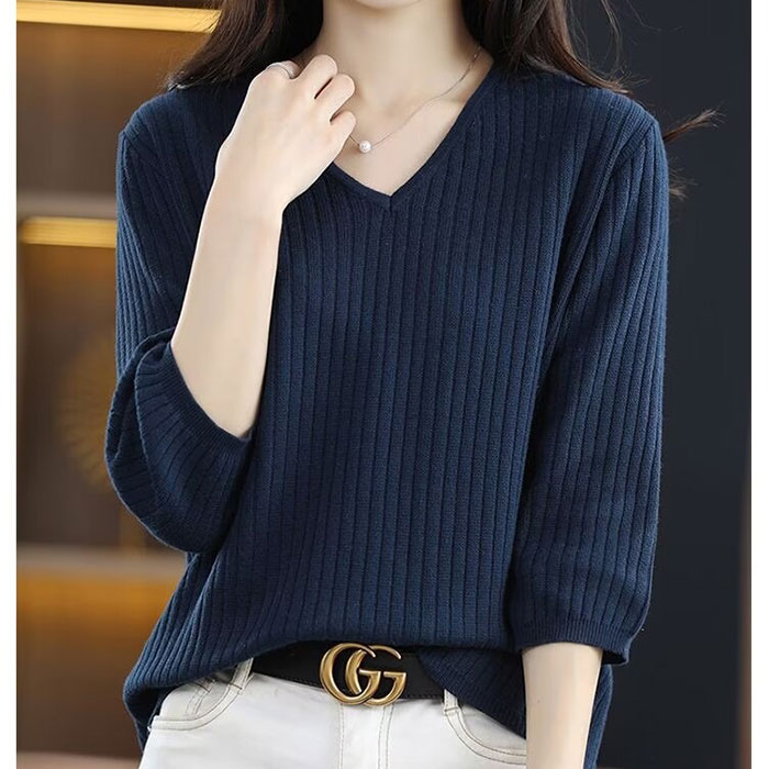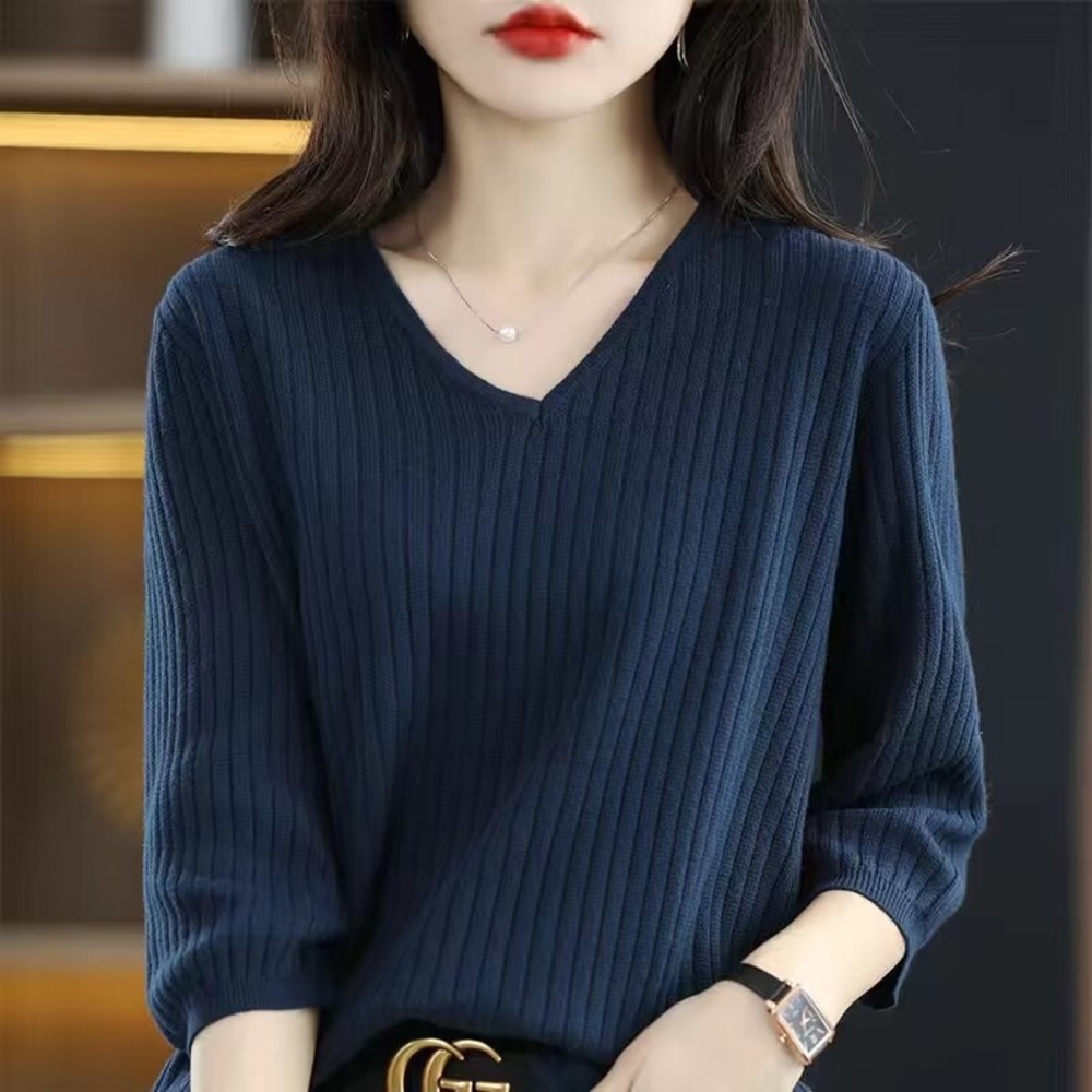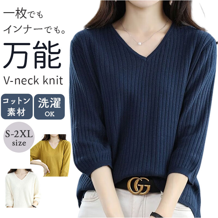 ☆ ネイビー ☆ 2XL ☆ 7分袖Tシャツ レディース Vネック レディース トップス きれいめ セーター ニット 7分袖 Vネック 收藏