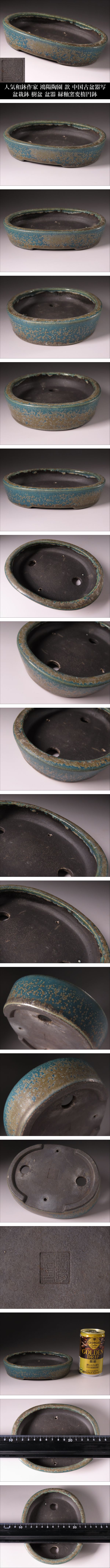 【ONE'S】人気和鉢作家 鴻陽陶園 款 中国古盆器写 盆栽鉢 植木鉢 樹盆 盆器 緑釉窯変楕円鉢 幅15.3cm 古美術品 | |||