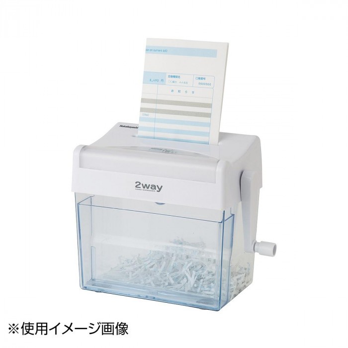 | 紙とカードの処理が1台で可能な手動式のシュレッダーです。はがき(A6)サイズ対応で、紙とカードの細断くずを分別できるケース付きです。 |