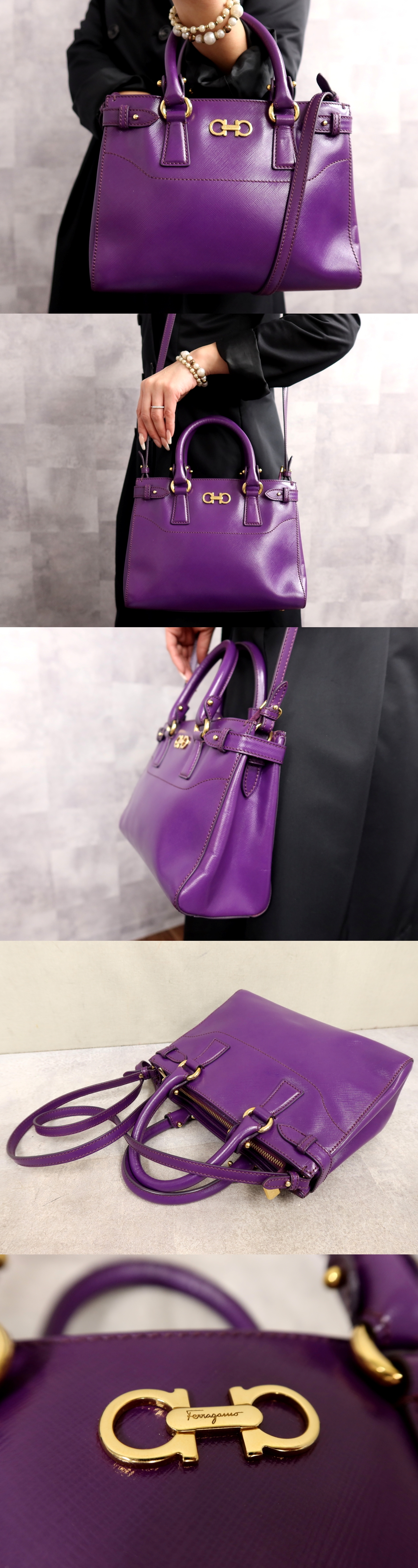 ●超美品●Salvatore Ferragamo フェラガモ●ダブルガンチーニ●サフィアーノ レザー 本革●2way ハンド バッグ●パープル●G金具●Js65619 收藏