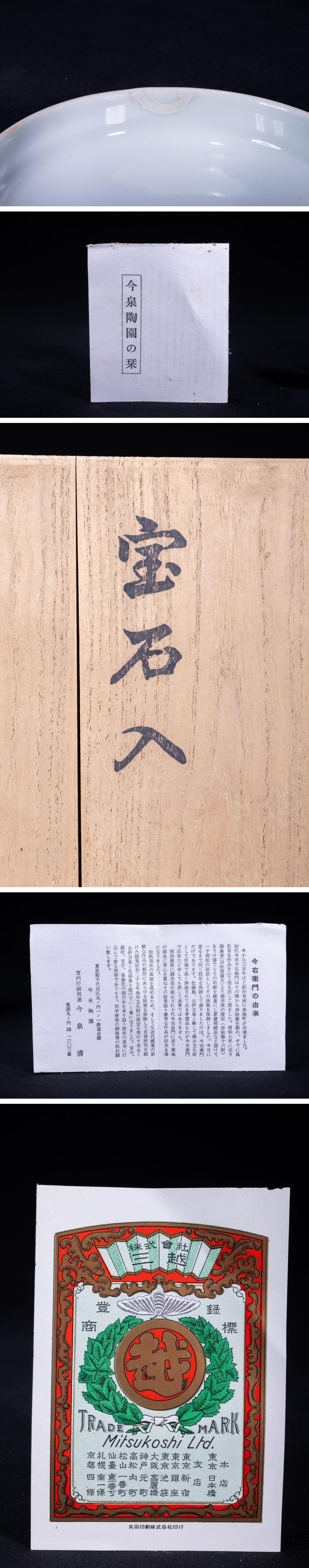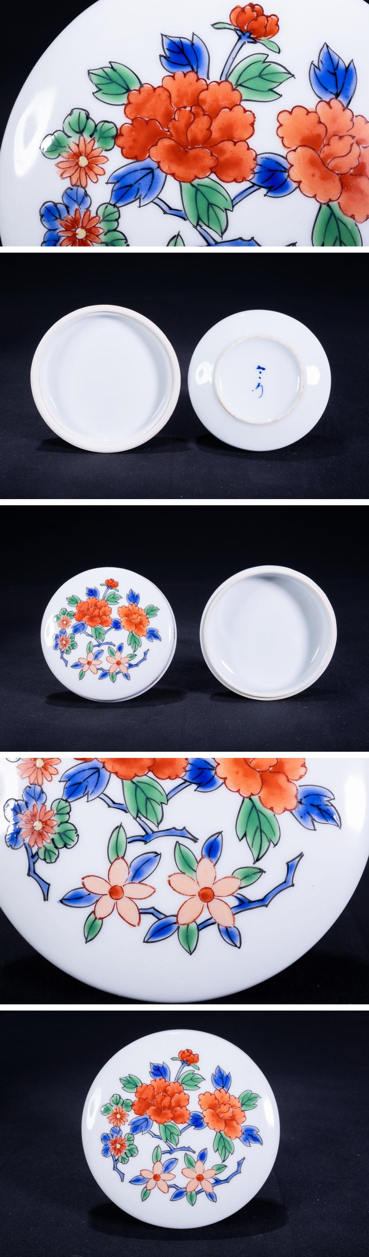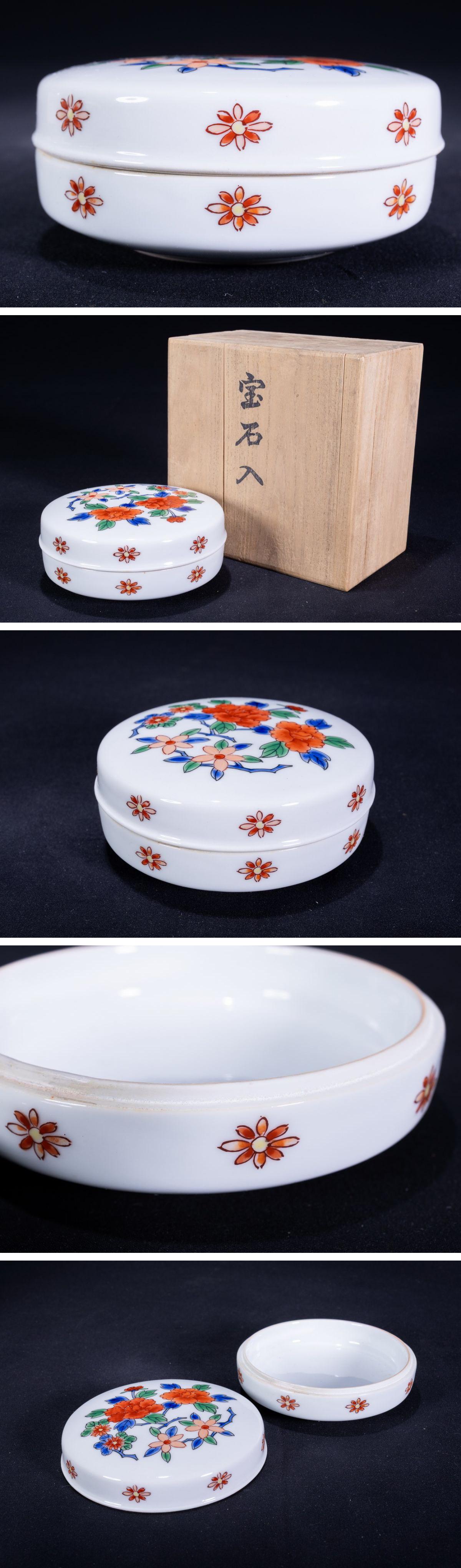 【珍品堂】1円から 肥前有田焼 今右衛門 宝石入 染錦牡丹絵 香合 共箱 時代物 古美術 骨董品 H4cm 径10cm N-A7-ML13 收藏