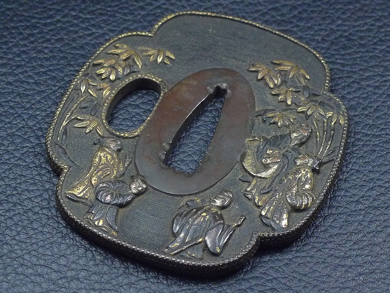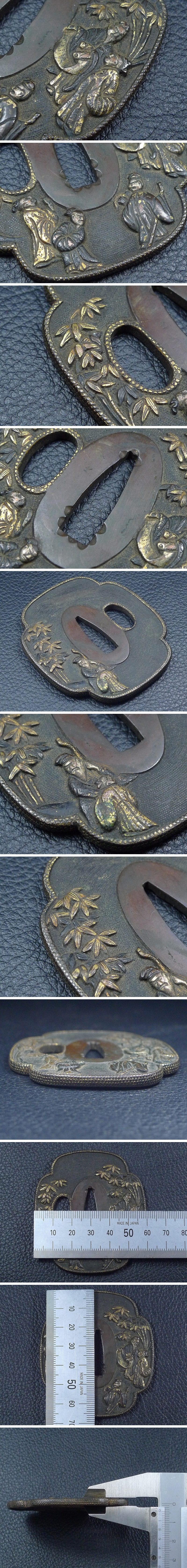 60TR103★時代武具 唐人笹文 象嵌 金覆輪 銅製 鍔/鐔/つば 重量83g 刀装具 日本刀 武器 美術刀剣 收藏