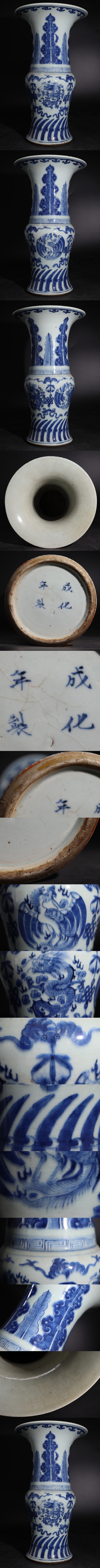 | 成化年製 底款 染付 龍 ・ 鳳凰紋 尊式瓶 / 明 成化 中国美術 花瓶 壺 煎茶飾 .G3641 |