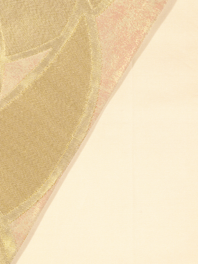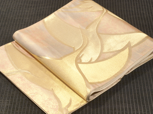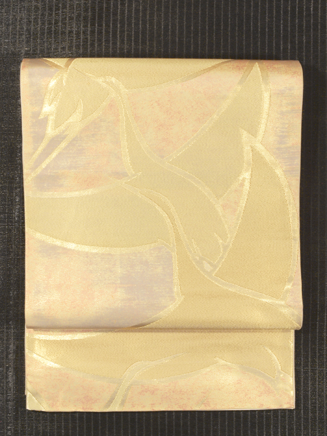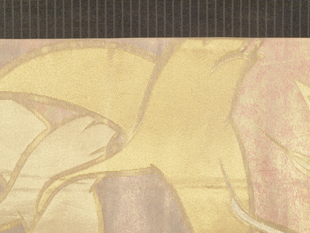 全体的な印象としては、淡い虹色や藤鼠(ふじねず)色で、ぼかしのある霞(かすみ)の文様が織り込まれた地に、飛鶴(ひかく)の文様が織り込まれている、西陣織の袋帯です。 大きく羽を広げた飛が配された意匠は、格調高く、縁起が良さそうなきらめきを放っています。全体的におぼろげなお色目なので、上品なかわいらしさと雅びさが感じられます。 ユーズド品で、前の折り跡と結びジワがあり、胴回りの柄抜き部分の折り跡がうすよごれているほか、同じく胴回りの柄抜き部分にこまなかなうすよごれやくすみがちらほらとあります。また、お太鼓の裏に回る部分に直径約 2mm の箔の変色が 1 か所ありますが、いずれもご着用時には隠れるので、気にはならなさそうです。そのほかに目につく大きなしみやよごれ、褪色などのダメージはありません。 |