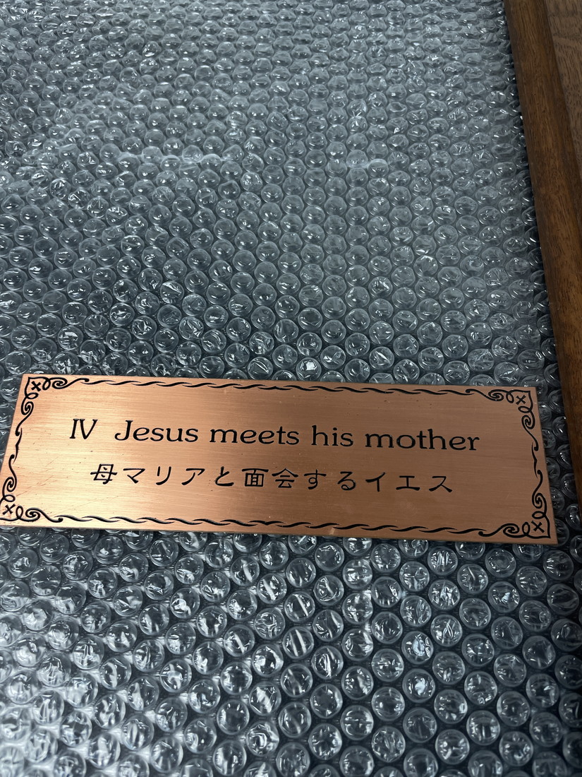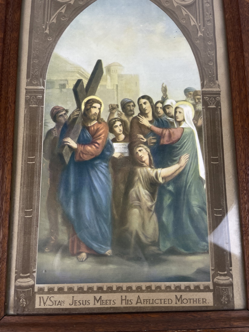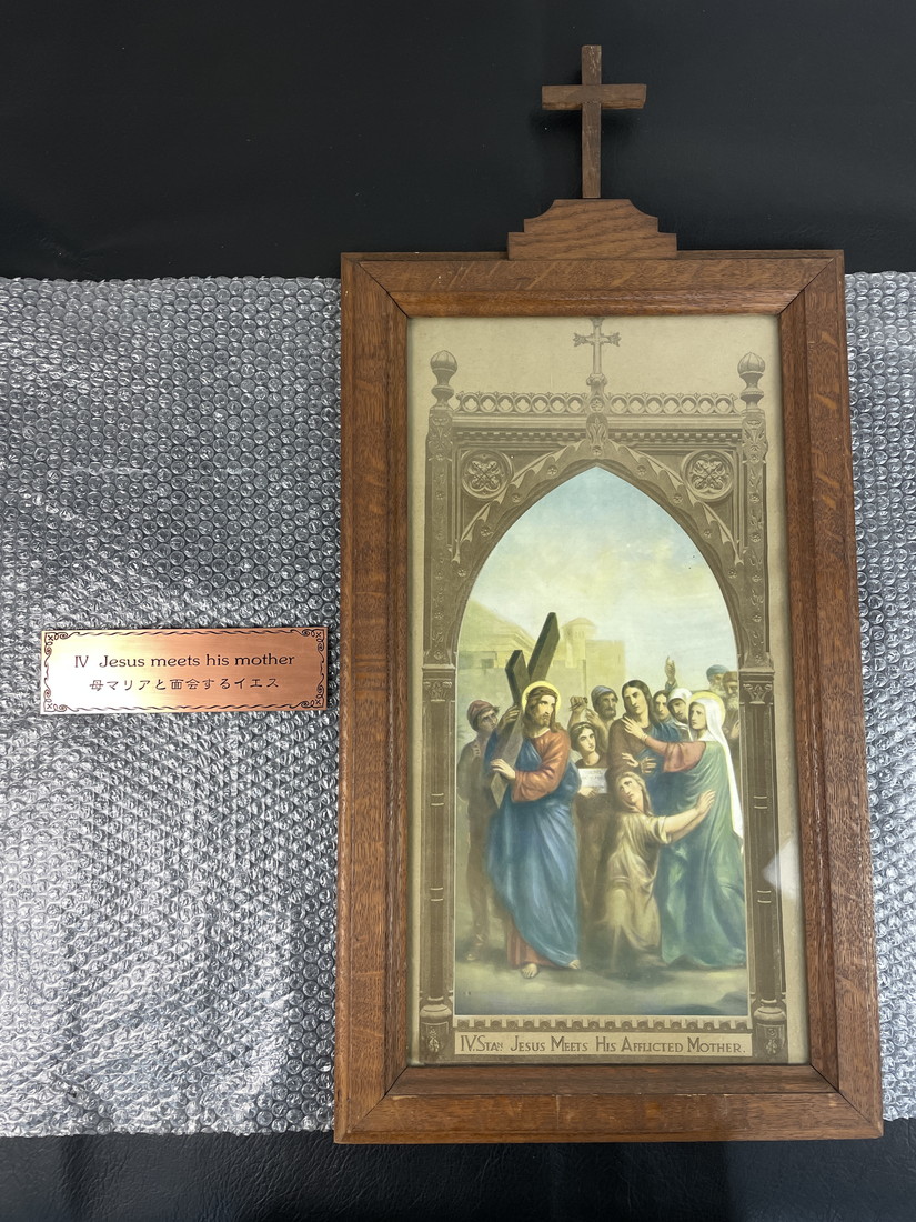 キリスト教 絵画 第4留 母マリアと面会するイエス 木製フレーム 十字架付き 銘板付 宗教画 聖画 額装 約78cm 管Y2874N 收藏