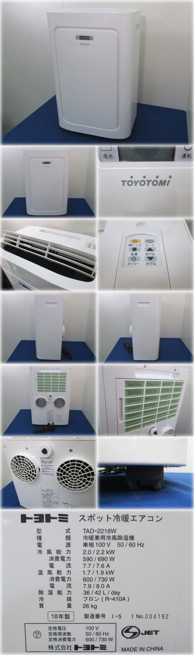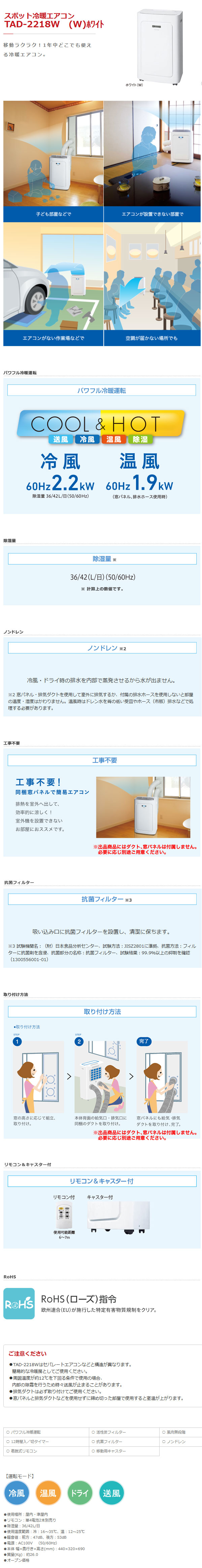 トヨトミ 移動式冷暖エアコン TAD-2218W(W) を出品いたします。 ■特徴■ 移動ラクラク! 1年中どこでも使える冷暖エアコン。 パワフル冷暖運転 送風/冷風/温風/除湿ができます。 冷風2.2kW(60Hz)、温風1.9kW(60Hz)※の 運転ができます。 ※窓パネル、排水ホース使用時(出品商品には付属しません) 除湿量 最大で36/42(L/日)(50/60Hz)の除湿ができます。 ※計算上の数値です。 抗菌フィルター 吸い込み口に抗菌フィルターを設置し、 清潔に保ちます。 リモコン&キャスター付 リモコンとキャスターが付いています。 リモコンの使用可能距離は6~7mです。 ■仕様■