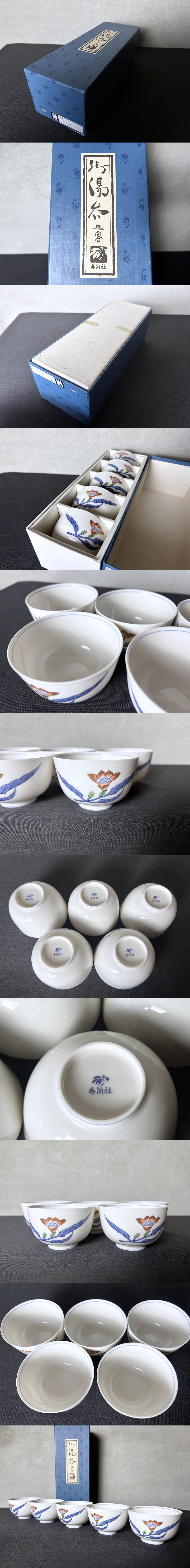 香蘭社 御湯呑 五客 茶器◇茶碗/茶盃/汲み出し/ゆのみ/煎茶道具/陶磁器/白磁/色絵/印彩/有田焼/伝統工芸/美品/未使用 收藏