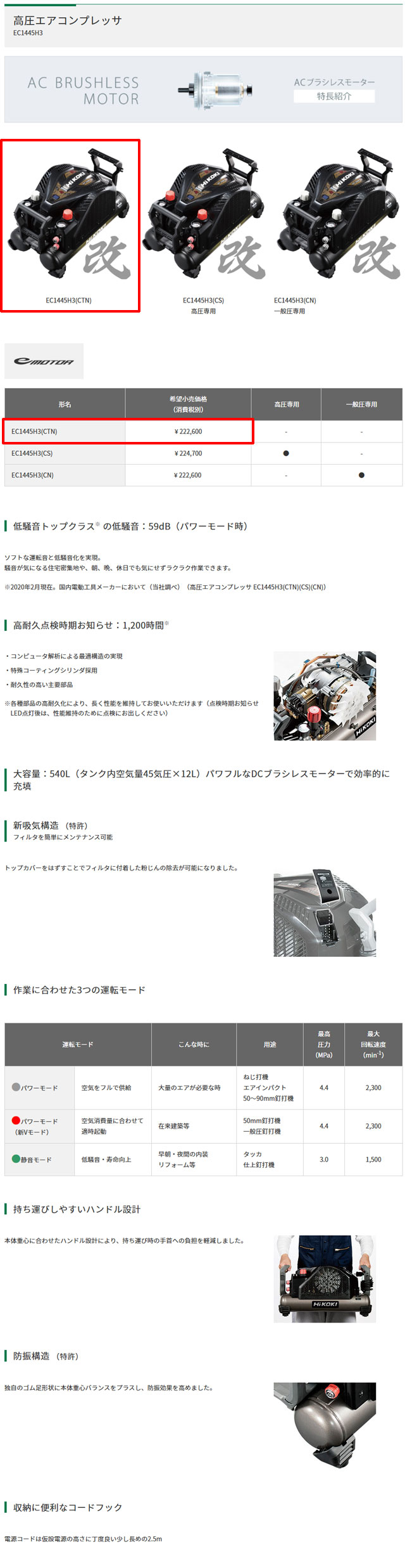 HiKOKI 高圧/常圧兼用エアコンプレッサー EC1445H3(CTN) を出品いたします。 ■特徴■ 低騒音トップクラスの低騒音:59dB(パワーモード時) ソフトな運転音と低騒音化を実現。 騒音が気になる住宅密集地や、 朝、晩、休日でも気にせずラクラク作業できます。 大容量:540L(タンク内空気量45気圧×12L) パワフルなDCブラシレスモーターで効率的に充填 新吸気構造 (特許) フィルタを簡単にメンテナンス可能 トップカバーをはずすことでフィルタに付着した 粉じんの除去が可能になりました。 作業に合わせた3つの運転モード 持ち運びしやすいハンドル設計 本体重心に合わせたハンドル設計により、 持ち運び時の手首への負担を軽減しました。 防振構造 (特許) 独自のゴム足形状に本体重心バランスをプラスし、 防振効果を高めました。 収納に便利なコードフック 電源コードは仮設電源の高さに 丁度良い少し長めの2.5m エア不足を解消エアコンプレッサ2台連結可能 連結には、専用ホースを必ずご使用ください (他のホースは使用できません) ■仕様■