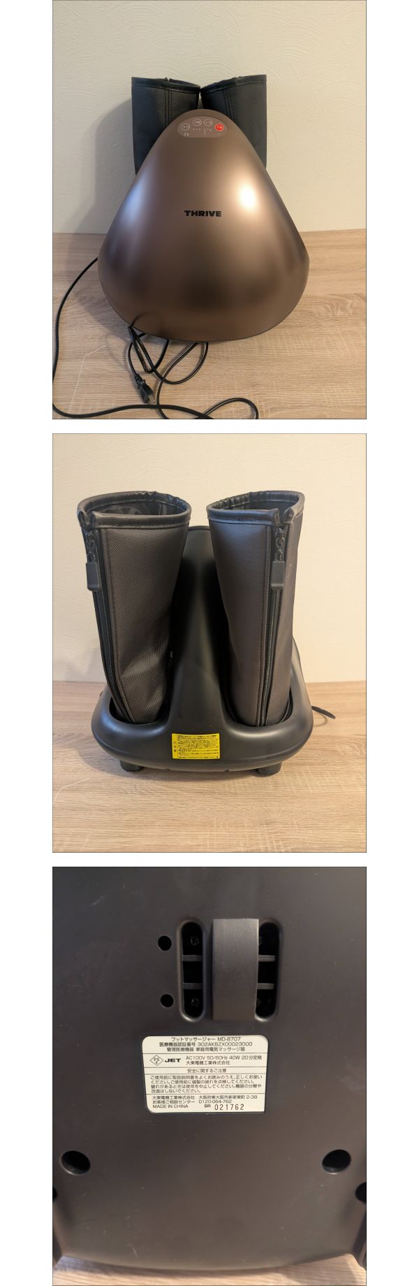 | 商品説明 | 【商品について】 ご覧いただきありがとうございます。 この度出品いたしますのは「 ●【動作品】THRIVE フットマッサージャー MD-8707 エアーマッサージ ふくらはぎ マッサージ機● 」でございます。 個人所有物の整理のため、出品する運びとなりました。 中古品ではございますが、ご活用いただける方にお譲りできれば幸いです。 商品の状態、付属品、寸法等につきましては、掲載写真にてご確認をお願いいたします。 補足:当方、ペットの飼育および喫煙の習慣はございません。お気にされる方はご参考ください。