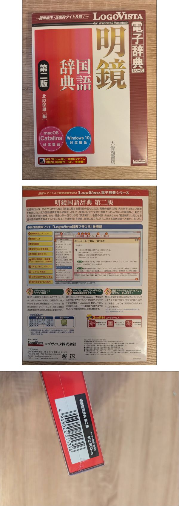 | 商品説明 | 【商品について】 ご覧いただきありがとうございます。 この度出品いたしますのは「 ●【未開封】LogoVista電子辞典 大修館 明鏡国語辞典 第二版 Windows Mac● 」でございます。 個人所有物の整理のため、出品する運びとなりました。 中古品ではございますが、ご活用いただける方にお譲りできれば幸いです。 商品の状態、付属品、寸法等につきましては、掲載写真にてご確認をお願いいたします。 補足:当方、ペットの飼育および喫煙の習慣はございません。お気にされる方はご参考ください。